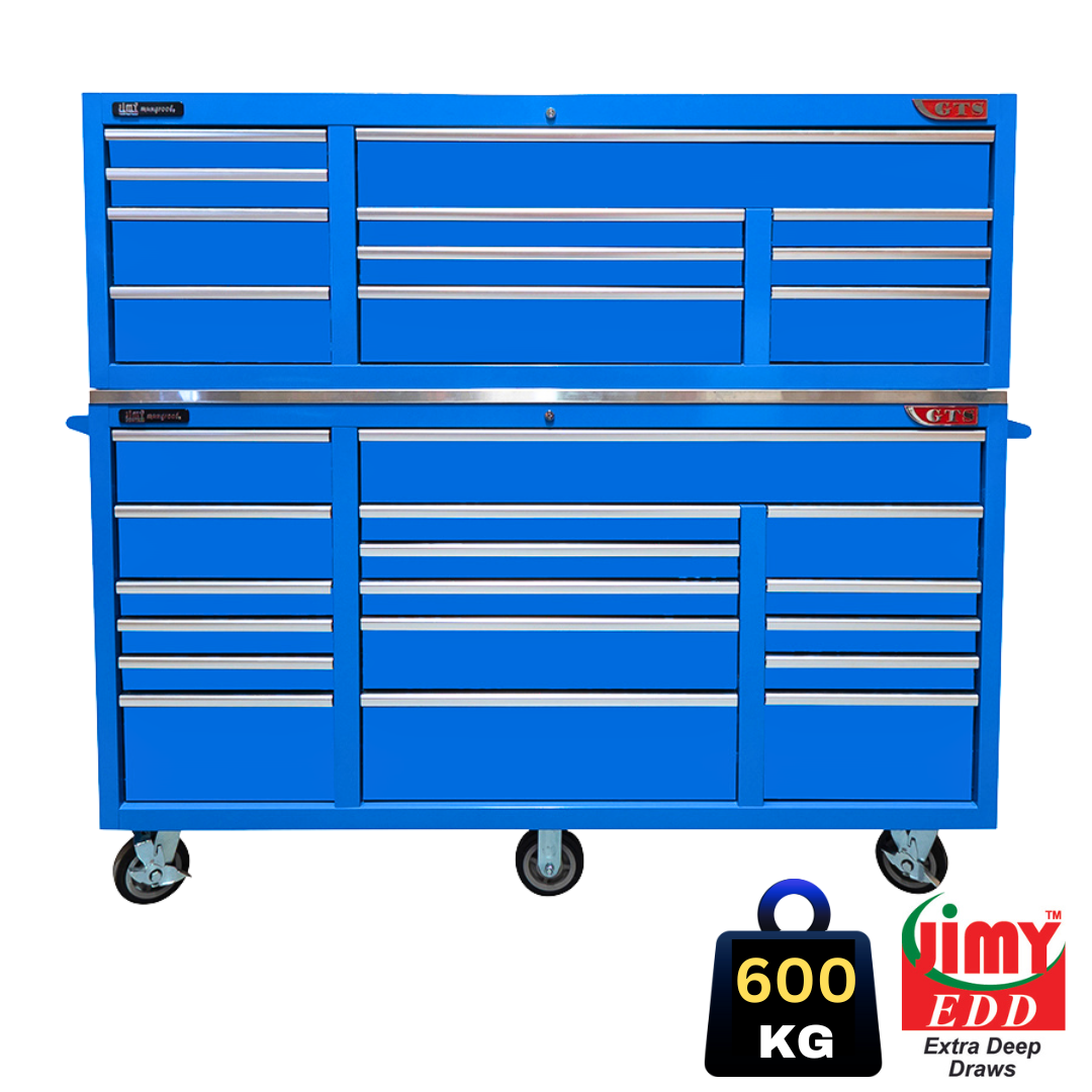 Jimy tool boxes are built to last! Tough industrial powder coating, 1.2mm gauge steel thickness, fully lockable & ball bearing slide rails on the drawers with twin slide rails on the deeper drawers. Drawers fitted with Click-lock mechanism.