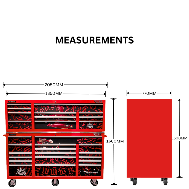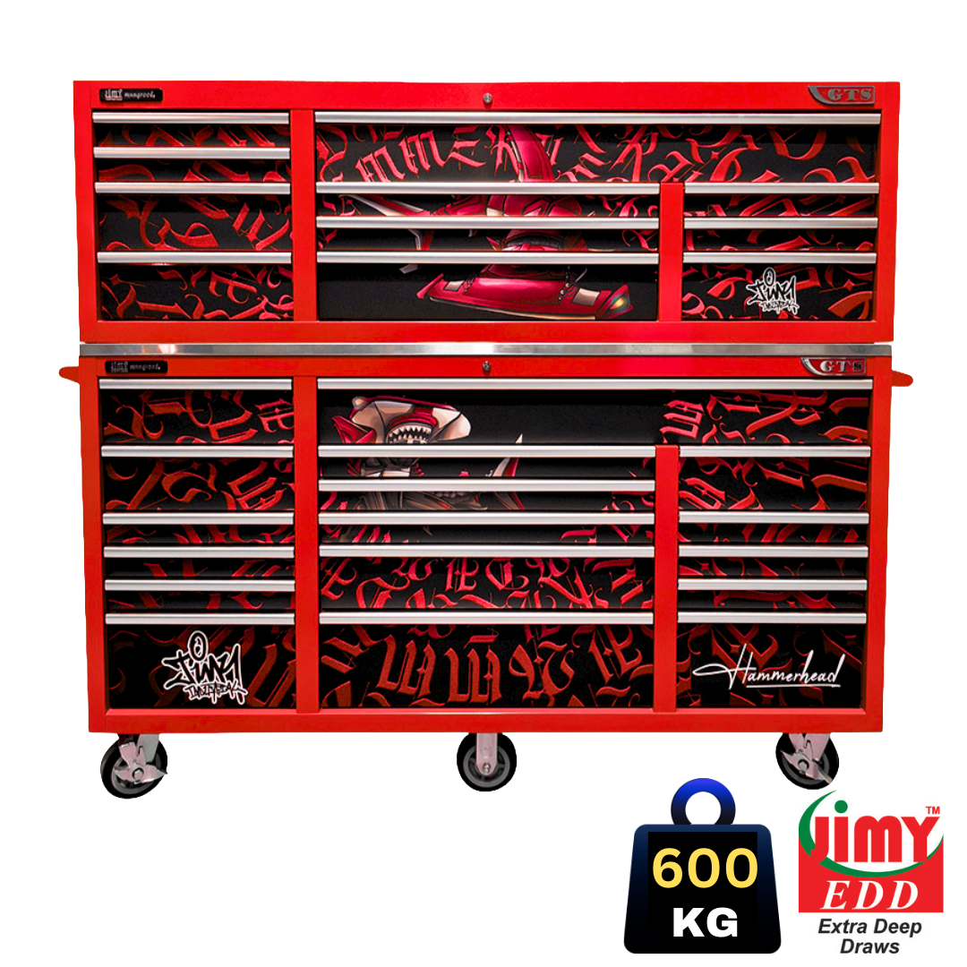 Jimy tool boxes are built to last! Tough industrial powder coating, 1.2mm gauge steel thickness, fully lockable & ball bearing slide rails on the drawers with twin slide rails on the deeper drawers. Drawers fitted with Click-lock mechanism.