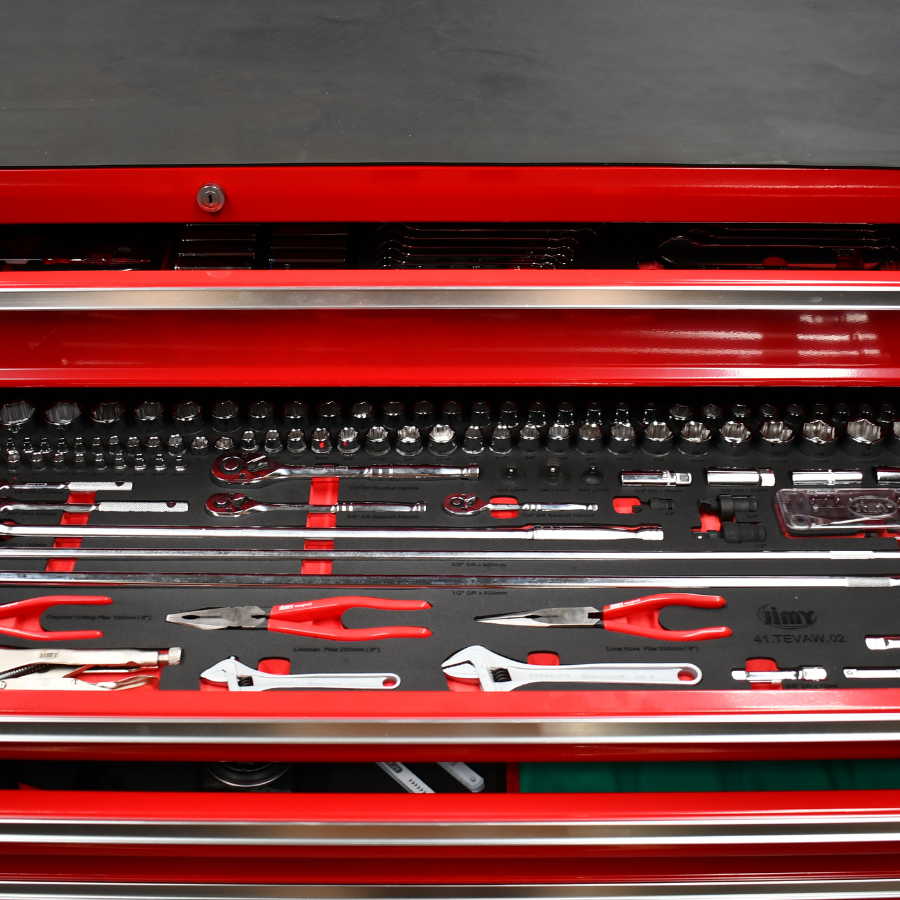 The 14 drawer mega mechanics tool kit from Jimy Tools offers a wide range of tools for the trade’s person. The kit consists of a 14 drawer heavy duty roller cabinet that has been powder coated with a tough industrial finish, 1.2mm thick steel, fully lockable with rear internal locking system and ball bearing slide drawers with twin slides on the deeper drawers. Included are metric 4mm – 32mm and SAE 5/32” – 1-1/4” sockets and a full complement of 1/4”, 3/8” and 1/2” drive socket accessories including ratchets, breaker bars, extensions bars from 50mm up to 900mm long plus metric and SAE impact sockets. There are ring open end ratchet and standard spanners in both metric and SAE, screwdrivers, pliers and even a 1/2” drive air impact wrench for the complete list of contents please check out the table below. With the high density foam drawer inserts you can easily see if you have left a tool on the job.