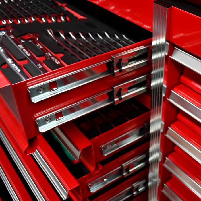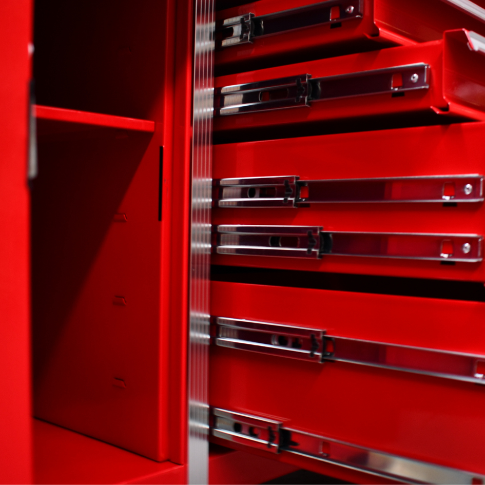 Jimy tool boxes are built to last! Tough industrial powder coating, 1.2mm gauge steel thickness, fully lockable & ball bearing slide rails on the drawers with twin slide rails on the deeper drawers.