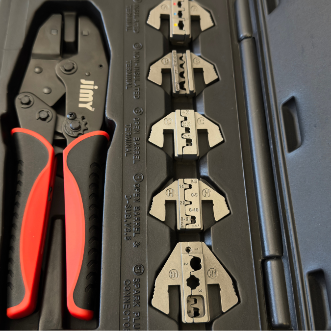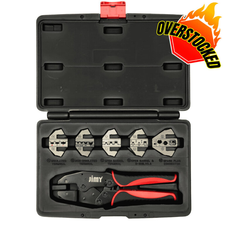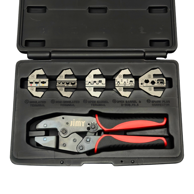 The Jimy 6-Piece Automotive Ratchet Crimping Plier Kit is a high-leverage, quick-release crimping system designed for fast, accurate and repeatable terminal crimping in automotive and electrical applications. The ratchet mechanism delivers consistent compression with less hand effort, while the tool-free die release system allows rapid changeover between five interchangeable crimp dies for insulated, non-insulated, open-barrel and specialty connectors. Supplied in a durable storage case, this kit provides a compact, workshop-ready solution for professional wiring and repair work.