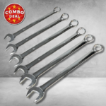 This 6-piece metric ring open end spanner set includes sizes from size 34mm up to 50mm based on the American ANSI standard and style of spanner with a 15 degree ring and jaw offset. These spanners with thick walls and a longer handle give more leverage and extra torque. Manufactured from quality chrome Vanadium steel polished to a mirror finish for corrosion resistance and available in many different sizes. These ROE spanners are exceptionally strong and are covered by Jimy’s lifetime warranty it makes this an excellent quality set and great value for money.
