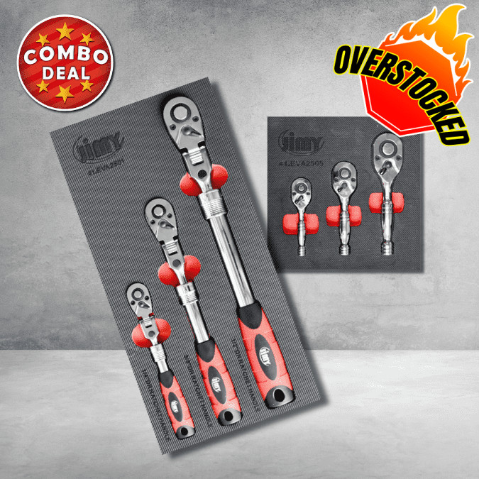 3 PIECE LONG HANDLE FLEX RATCHET TRAY 1/4”, 3/8” & 1/2” SQUARE DRIVE EVA INSERT TRAY