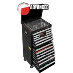 Commonly known as the ‘BLACK DEVIL’ this kit consists of a 10 drawer top box and 7 drawer roller cabinet that have been powder coated with a tough industrial finish, 1.2mm thick steel, fully lockable with rear internal locking system, dual gas strut system for lid and ball bearing slide drawers. Included are metric and SAE sockets in both standard and deep length (Cr-V) with a full complement of 1/4”, 3/8” and 1/2” drive socket accessories including ratchets, breaker bars, extensions bars and universals. There are ring open end ratchet and standard spanners in both metric and SAE, screwdrivers and pliers for the complete list of contents please check out the table below. With the high density foam drawer inserts you can easily see if you have left a tool on the job.