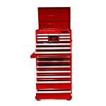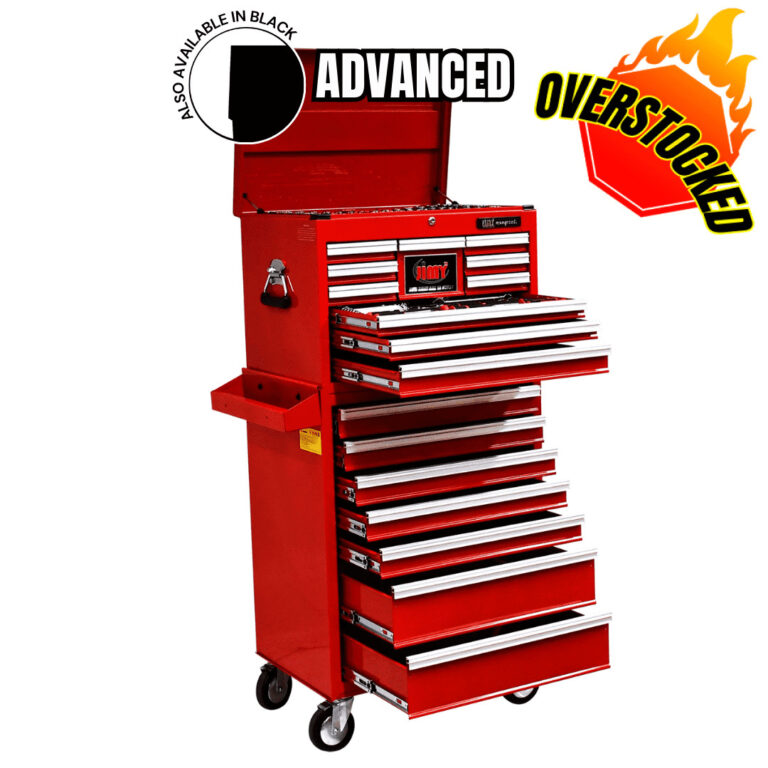 Commonly known as the ‘RED DEVIL’ this kit consists of a 10 drawer top box and 7 drawer roller cabinet that have been powder coated with a tough industrial finish, 1.2mm thick steel, fully lockable with rear internal locking system, dual gas strut system for lid and ball bearing slide drawers. Included are metric and SAE sockets in both standard and deep length (Cr-V) with a full complement of 1/4”, 3/8” and 1/2” drive socket accessories including ratchets, breaker bars, extensions bars and universals. There are ring open end ratchet and standard spanners in both metric and SAE, screwdrivers and pliers for the complete list of contents please check out the table below. With the high density foam drawer inserts you can easily see if you have left a tool on the job.
