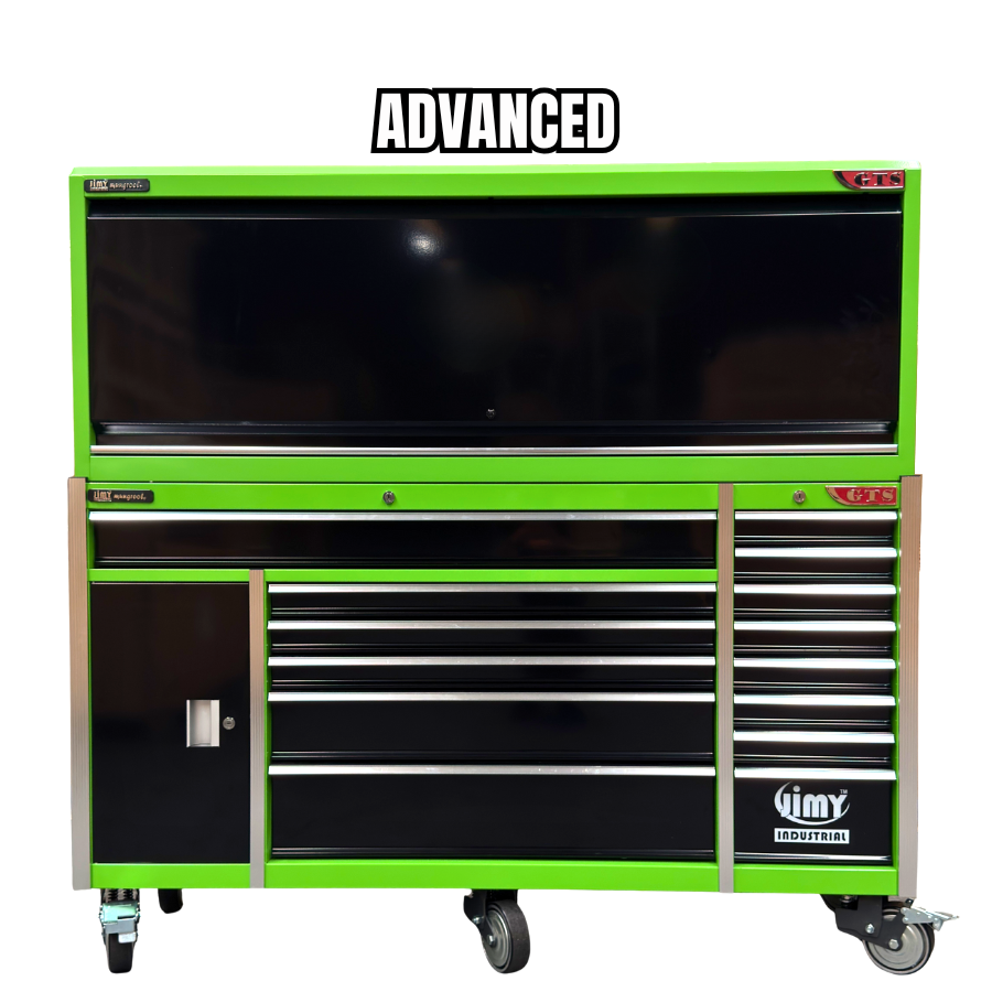 The 14 drawer “Advanced” hutch tool workshop from Jimy Tools offers a great range of tools for the professional mechanic. The kit consists of a hutch top box and a 14-drawer roller cabinet, all have been powder coated with a tough industrial finish, 1.2mm thick steel, fully lockable with rear internal locking system, dual gas strut system for the hutch and ball bearing slide drawers with twin slides on the deeper drawers.
