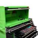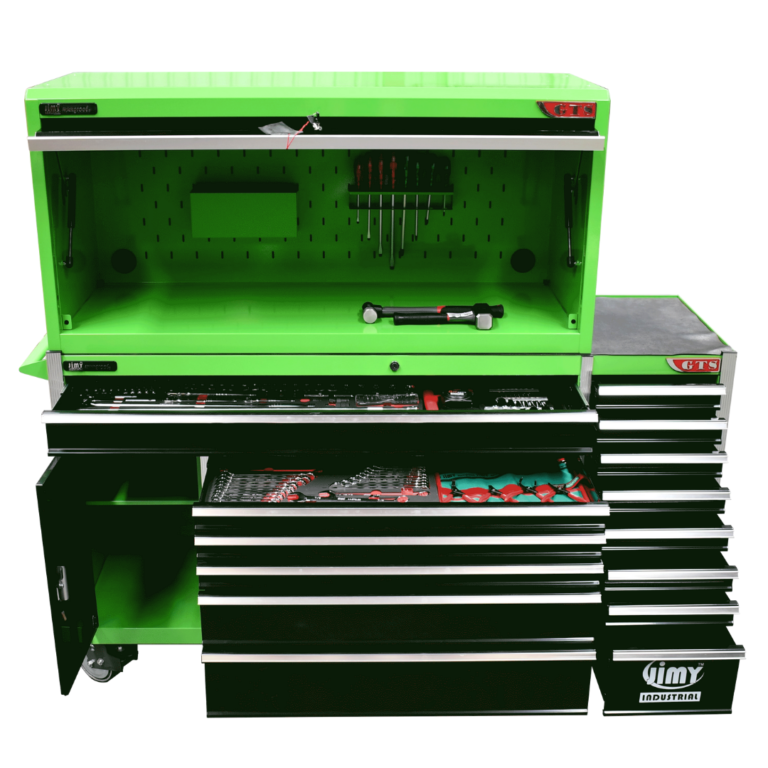 The 14 drawer “Advanced” hutch tool workshop from Jimy Tools offers a great range of tools for the professional mechanic. The kit consists of a hutch top box and an 11-drawer roller cabinet, all have been powder coated with a tough industrial finish, 1.2mm thick steel, fully lockable with rear internal locking system, dual gas strut system for the hutch and ball bearing slide drawers with twin slides on the deeper drawers.