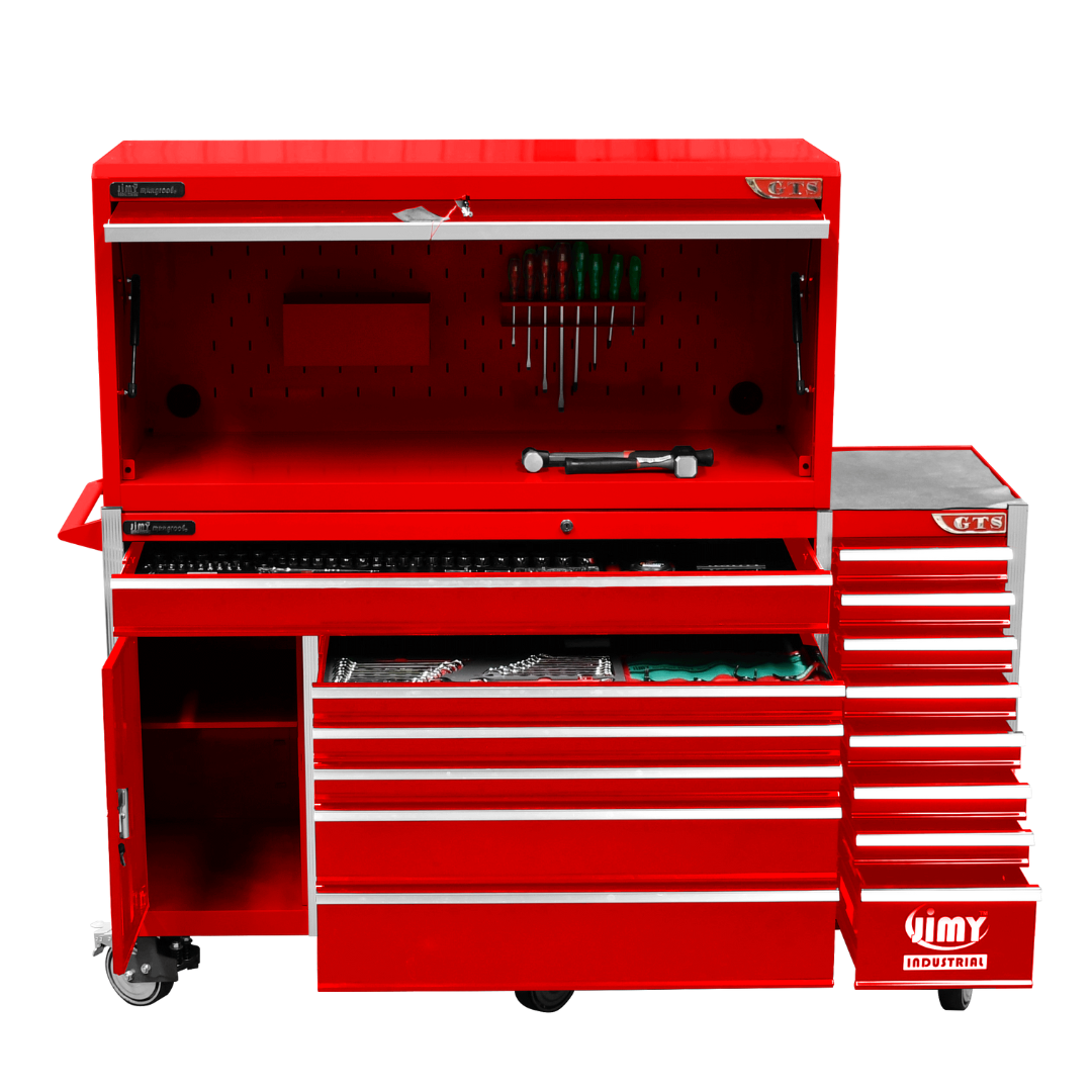 The 14 drawer “Advanced” hutch tool workshop from Jimy Tools offers a great range of tools for the professional mechanic. The kit consists of a hutch top box and an 11-drawer roller cabinet, all have been powder coated with a tough industrial finish, 1.2mm thick steel, fully lockable with rear internal locking system, dual gas strut system for the hutch and ball bearing slide drawers with twin slides on the deeper drawers.