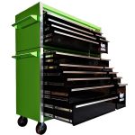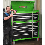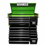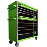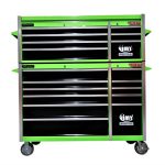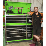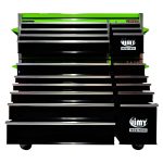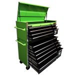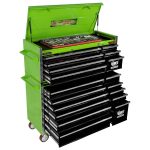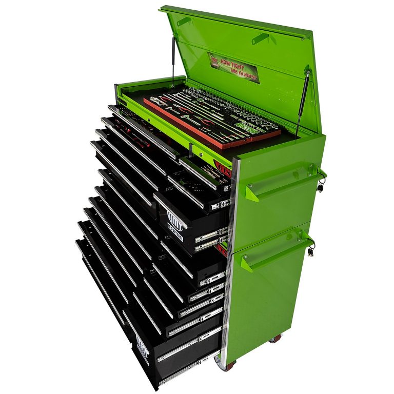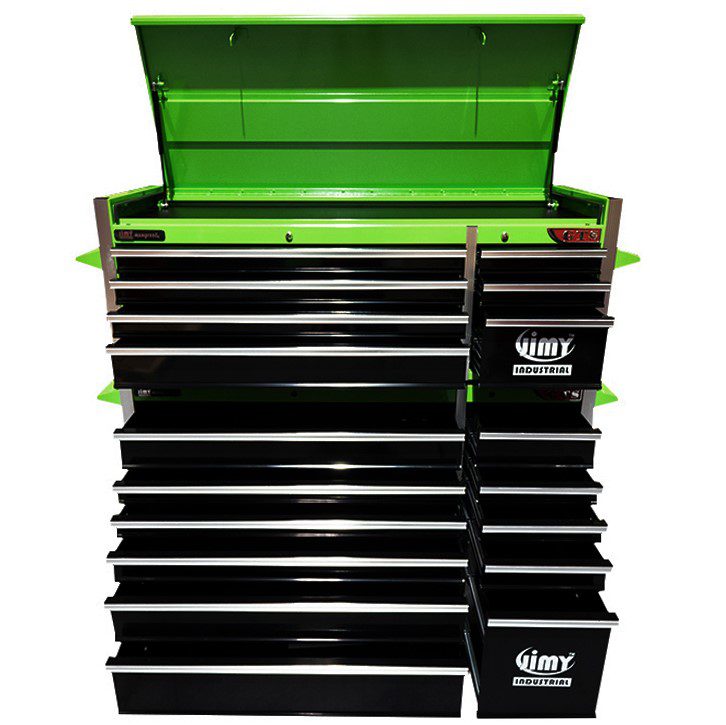 The 18 drawer “Monster Mechanic” tool kit from Jimy Tools offers a wide range of tools for the tradesperson. The kit consists of a 7-drawer top box and an 11-drawer roller cabinet, all have been powder coated with a tough industrial finish, 1.0mm thick steel, fully lockable with rear internal locking system, dual gas strut system for lid and ball bearing slide drawers with twin slides on the deeper drawers.
