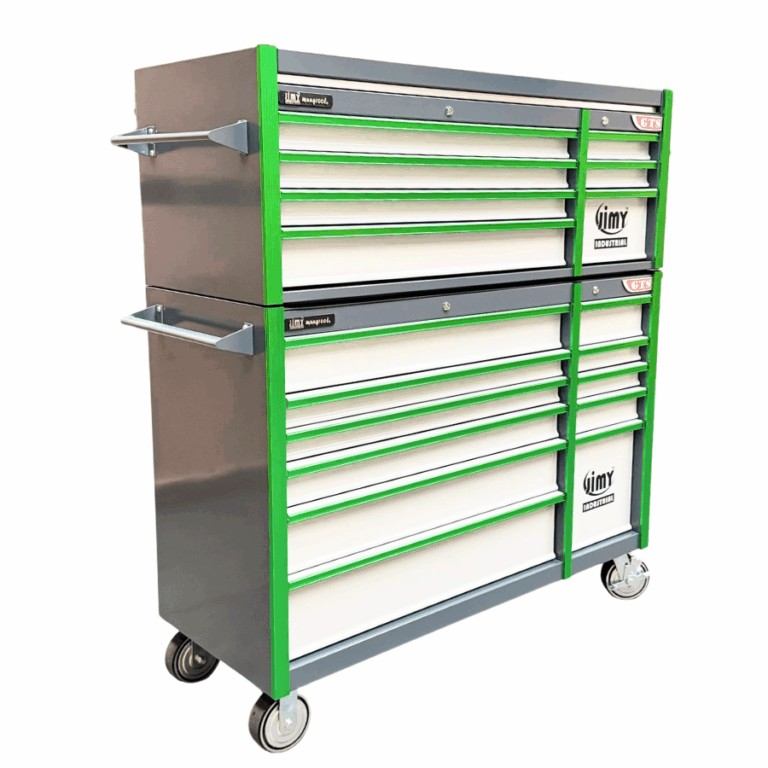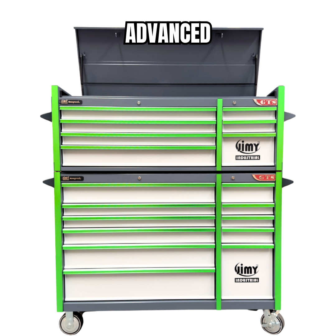The 18 drawer “Monster Mechanic” tool kit from Jimy Tools offers a wide range of tools for the tradesperson. The kit consists of a 7-drawer top box and an 11-drawer roller cabinet, all have been powder coated with a tough industrial finish, 1.0mm thick steel, fully lockable with rear internal locking system, dual gas strut system for lid and ball bearing slide drawers with twin slides on the deeper drawers.