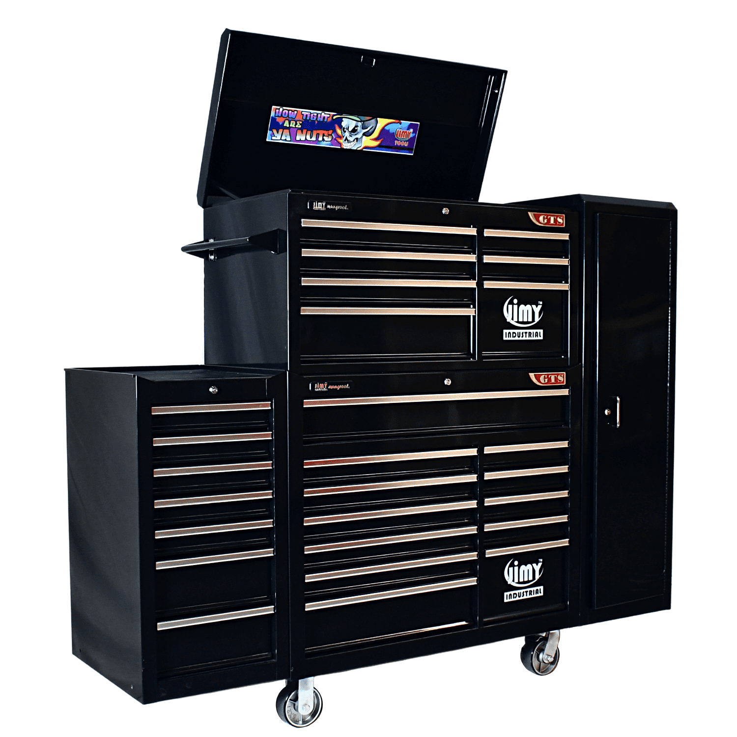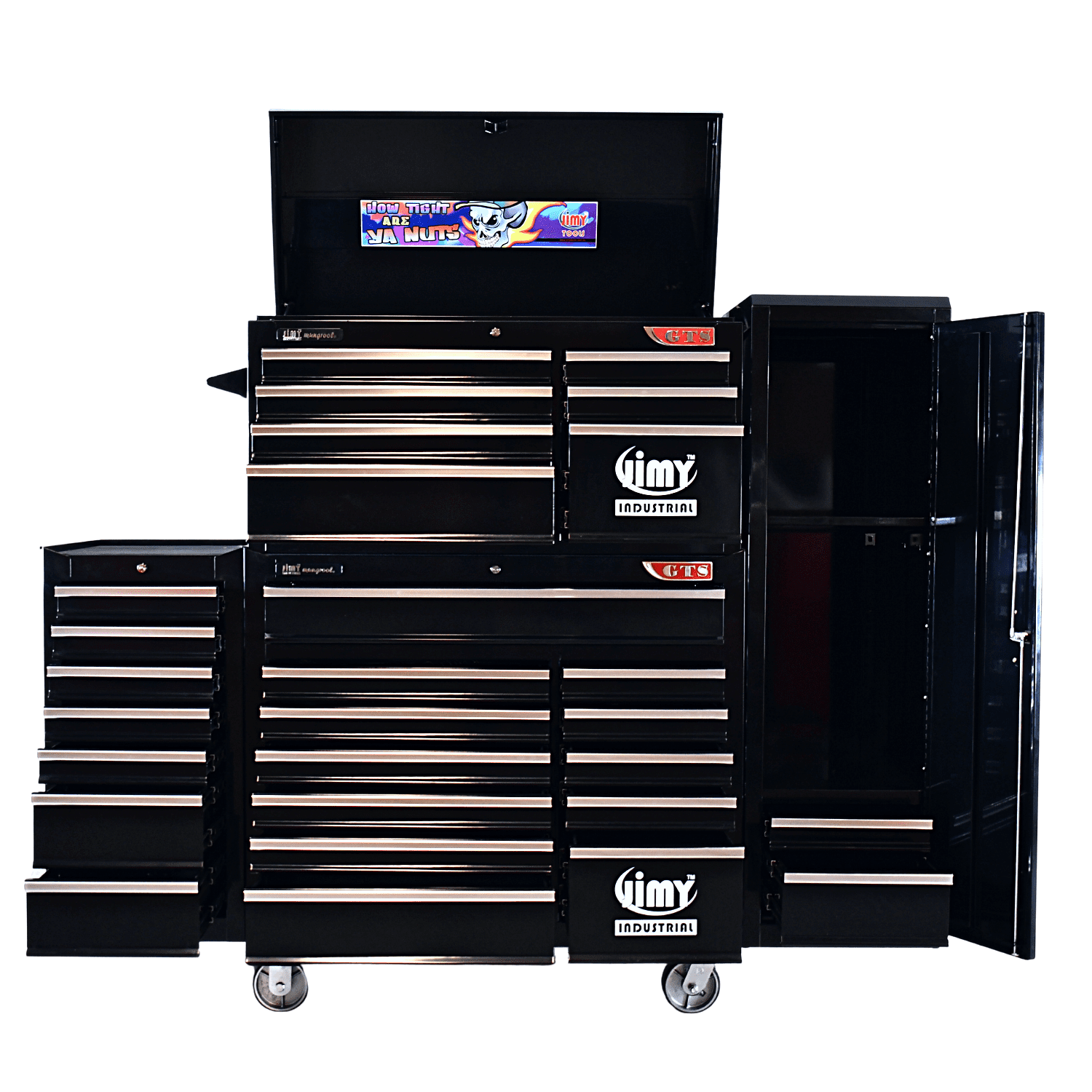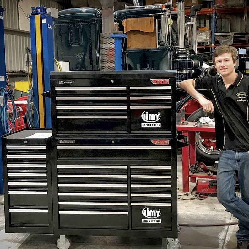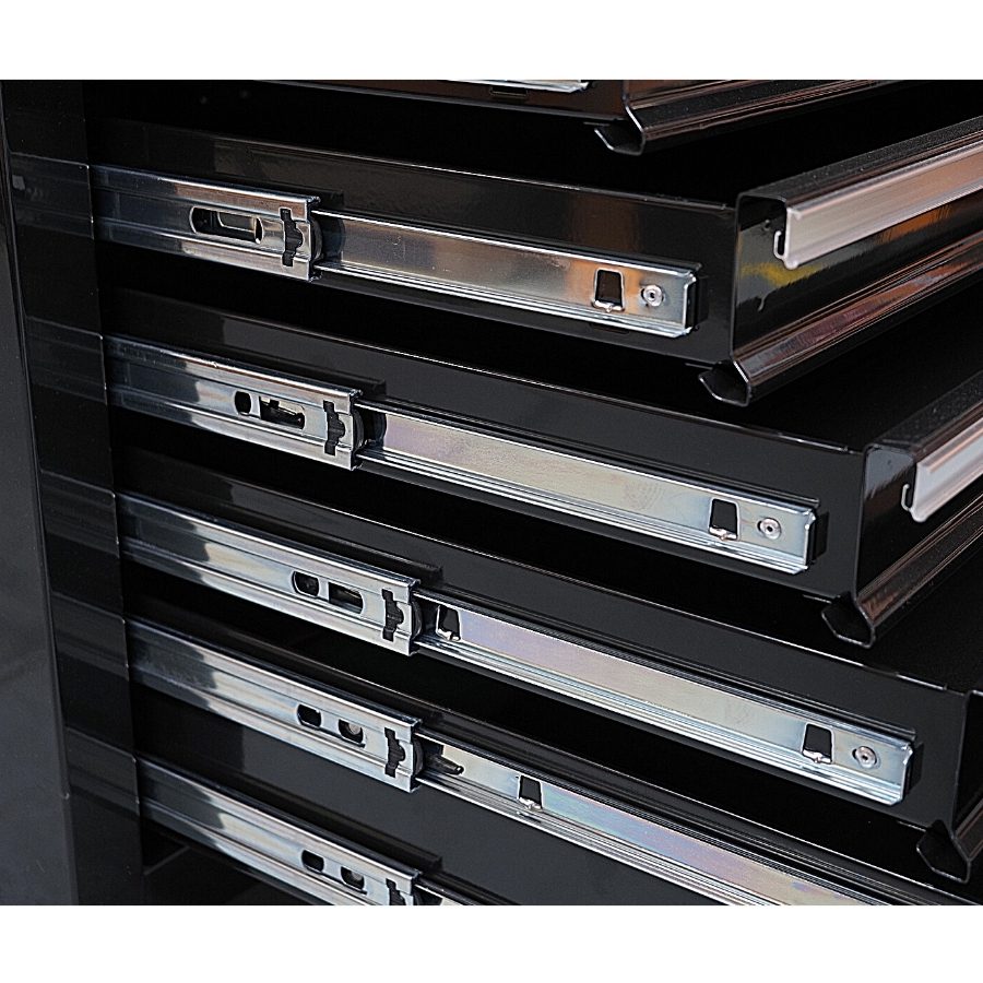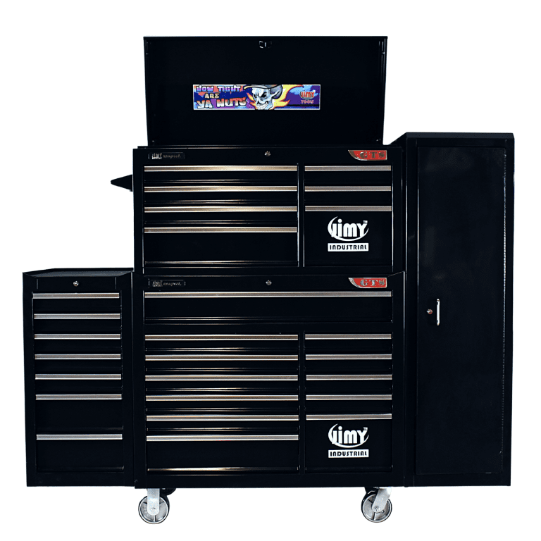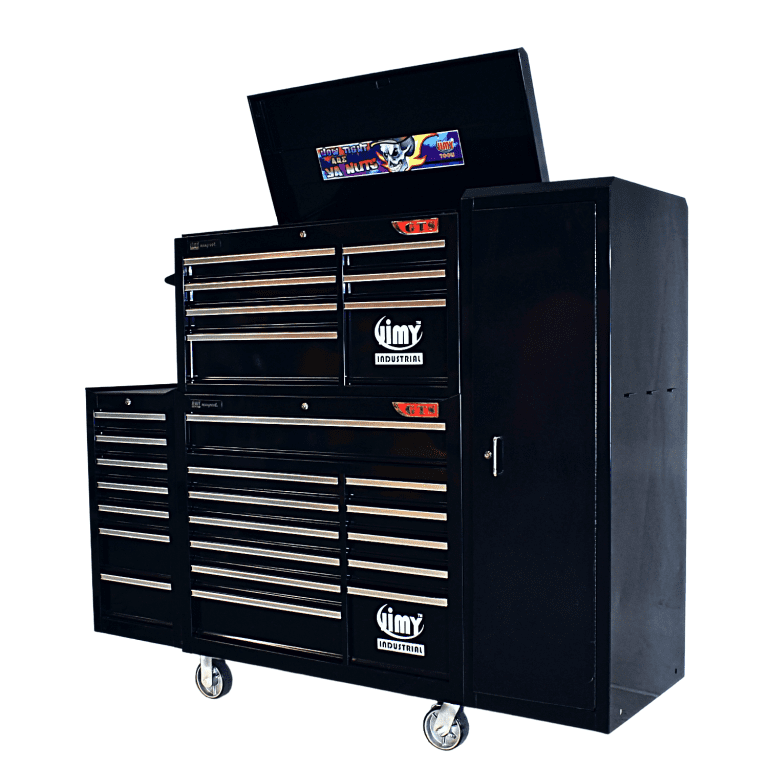 The 28 drawer “Monster Mechanic” tool kit from Jimy Tools offers a wide range of tools for the tradesperson. The kit consists of a 7 drawer top box and a 12 drawer roller cabinet, a 7 drawer side box & full height side locker attached that all have been powder coated with a tough industrial finish, 1.0mm thick steel, fully lockable with rear internal locking system, dual gas strut system for lid and ball bearing slide drawers with twin slides on the deeper drawers. Both add on side boxes and full height side locker are versatile and can be attached on alternate sides.