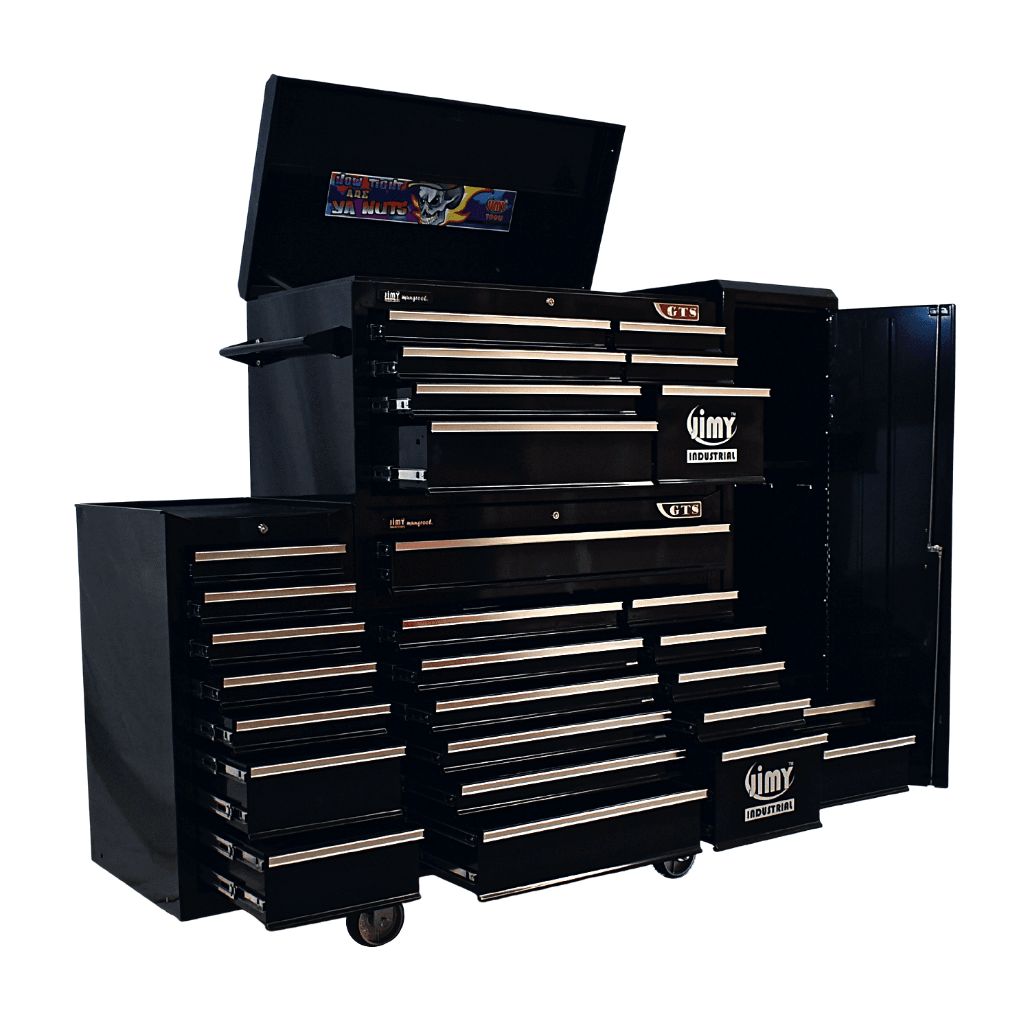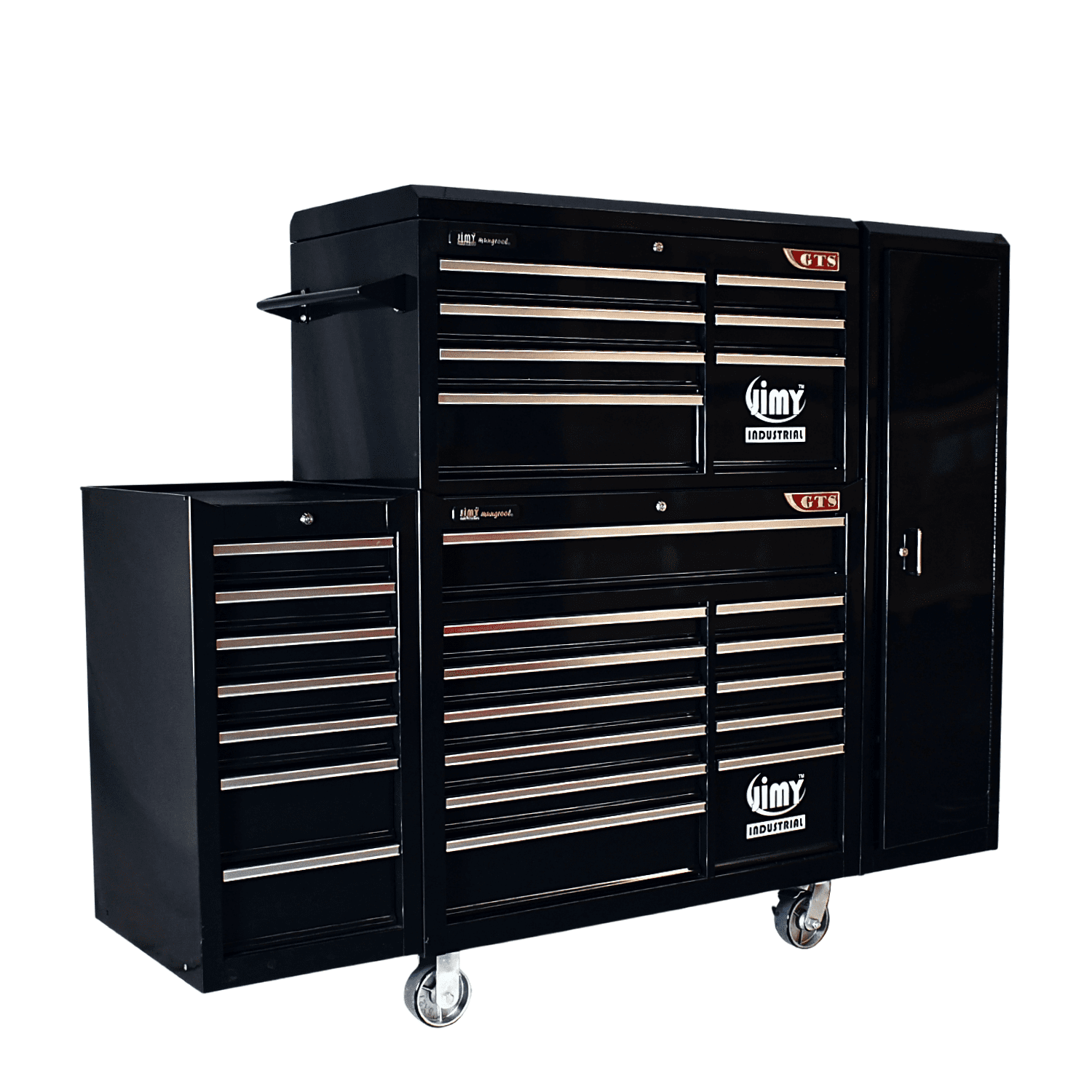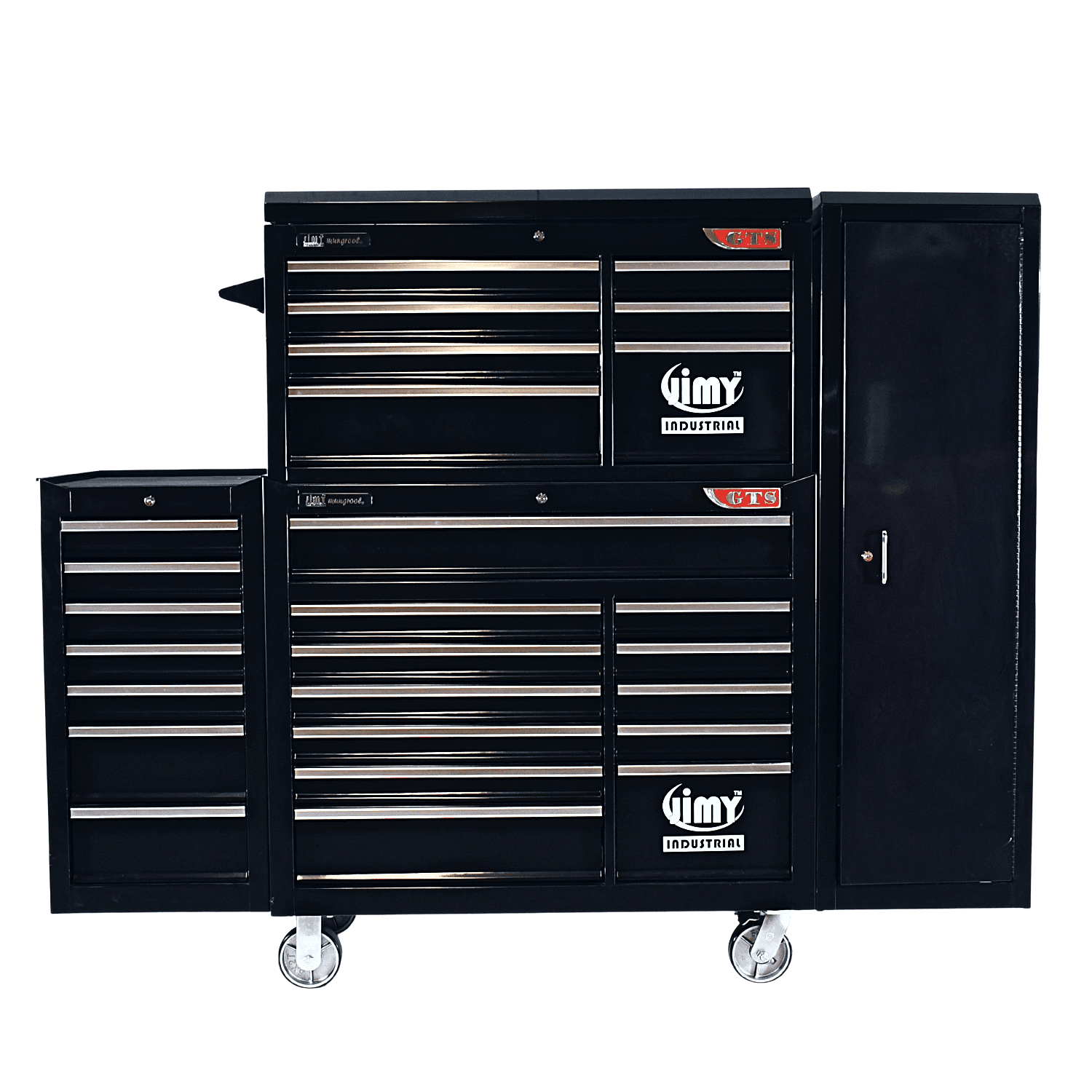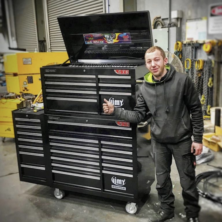 The 28 drawer “Monster Mechanic” tool kit from Jimy Tools offers a wide range of tools for the tradesperson. The kit consists of a 7 drawer top box and a 12 drawer roller cabinet, a 7 drawer side box & full height side locker attached that all have been powder coated with a tough industrial finish, 1.0mm thick steel, fully lockable with rear internal locking system, dual gas strut system for lid and ball bearing slide drawers with twin slides on the deeper drawers. Both add on side boxes and full height side locker are versatile and can be attached on alternate sides.