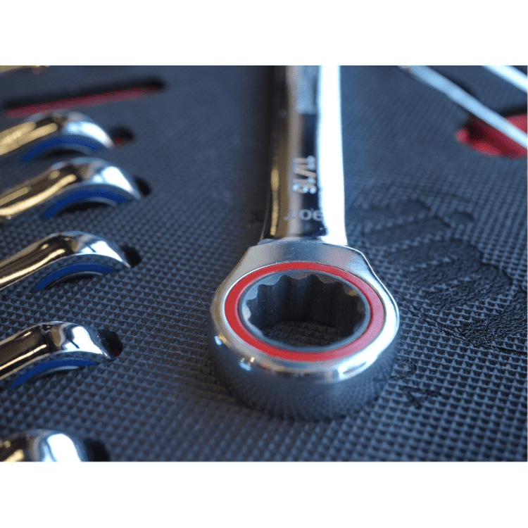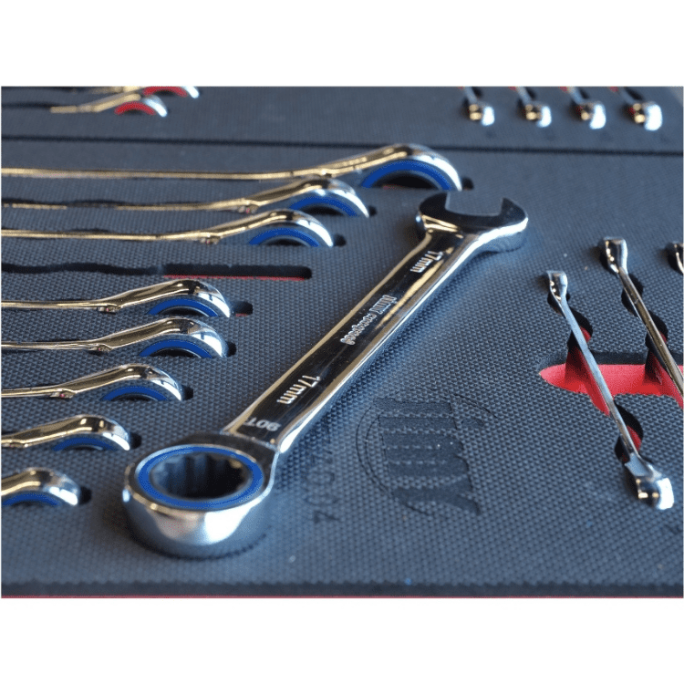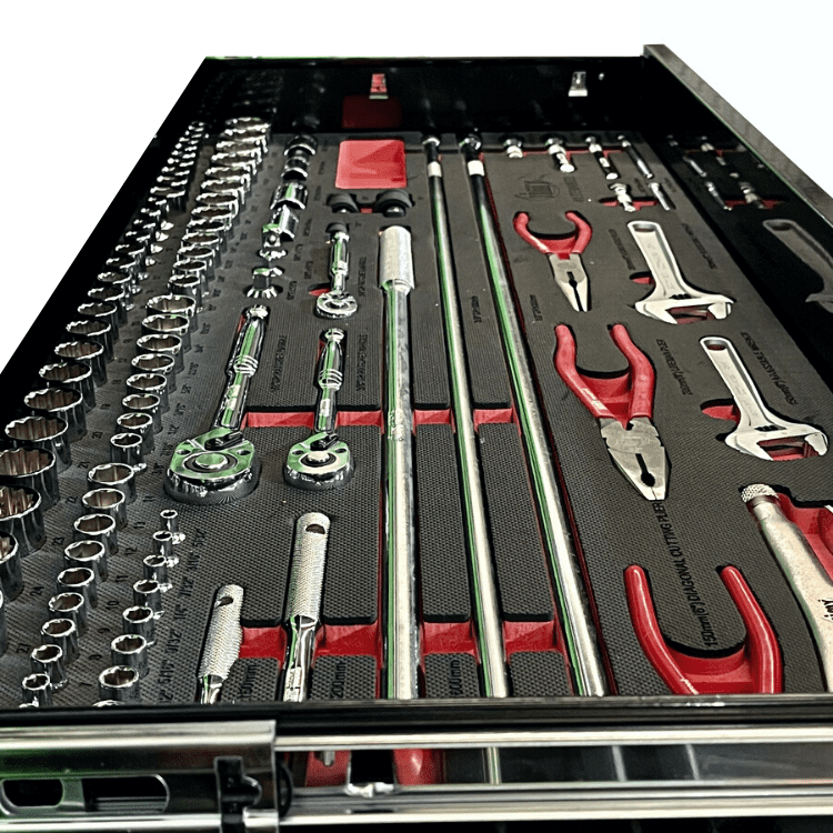 Included are metric 4mm – 32mm and SAE 5/32” – 1-1/4” sockets and a full complement of 1/4”, 3/8” and 1/2” drive socket accessories including ratchets, breaker bars, extensions bars, plus metric and SAE impact sockets. There are ROE ratchet and standard spanners in both metric and SAE, screwdrivers, pliers and plenty more; for the complete list of contents please check out the table below. With the high density foam drawer inserts you can easily see if you have left a tool on the job.