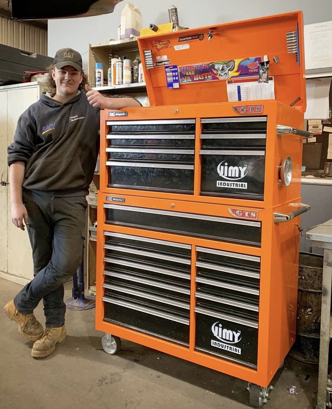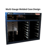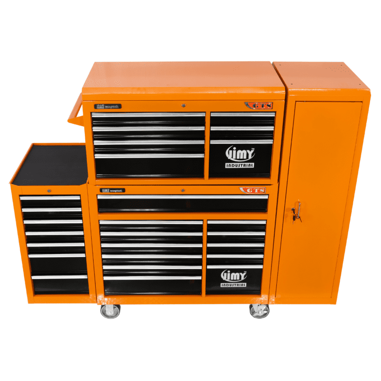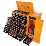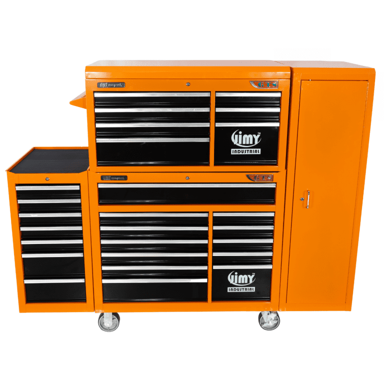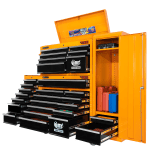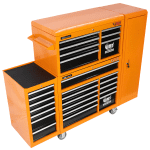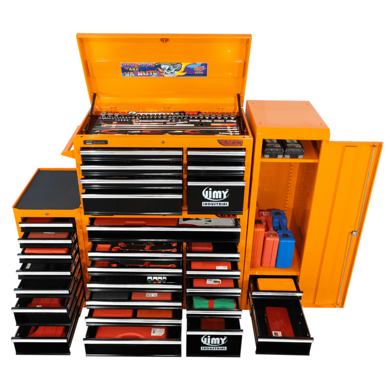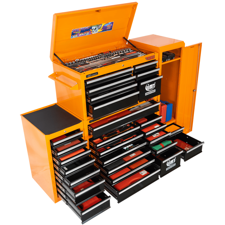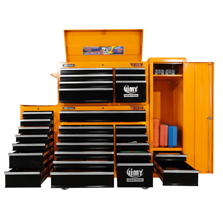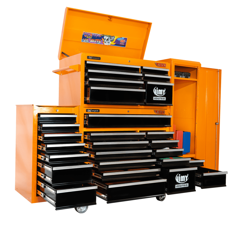 The 28 drawer “Monster Mechanic” tool kit from Jimy Tools offers a wide range of tools for the tradesperson. The kit consists of a 7 drawer top box and a 12 drawer roller cabinet, a 7 drawer side box & full height side locker attached that all have been powder coated with a tough industrial finish, 1.0mm thick steel, fully lockable with rear internal locking system, dual gas strut system for lid and ball bearing slide drawers with twin slides on the deeper drawers. Both add on side boxes and full height side locker are versatile and can be attached on alternate sides.