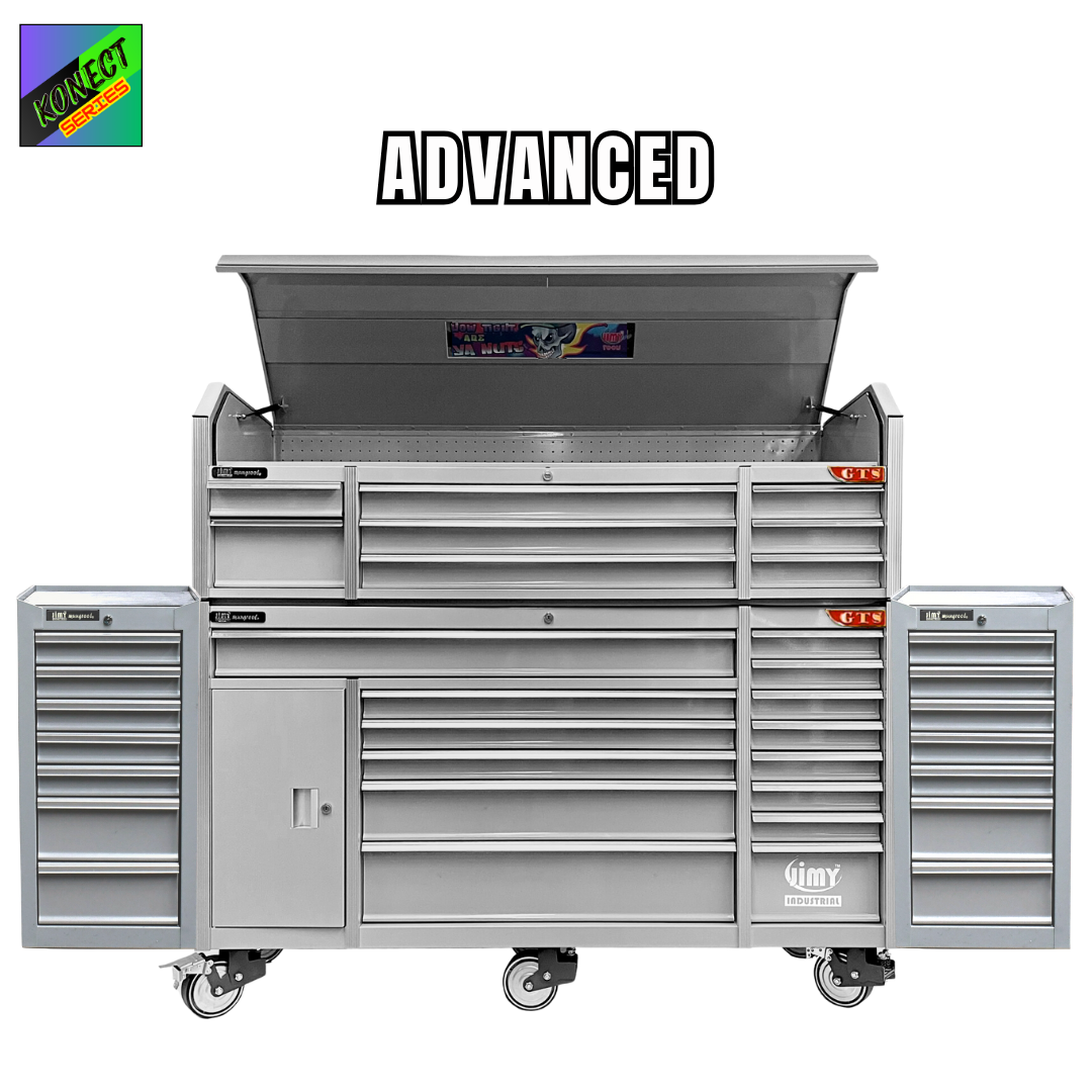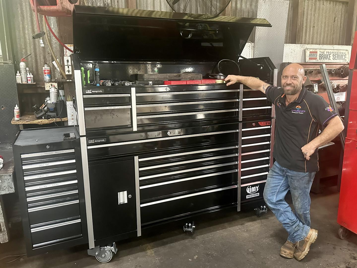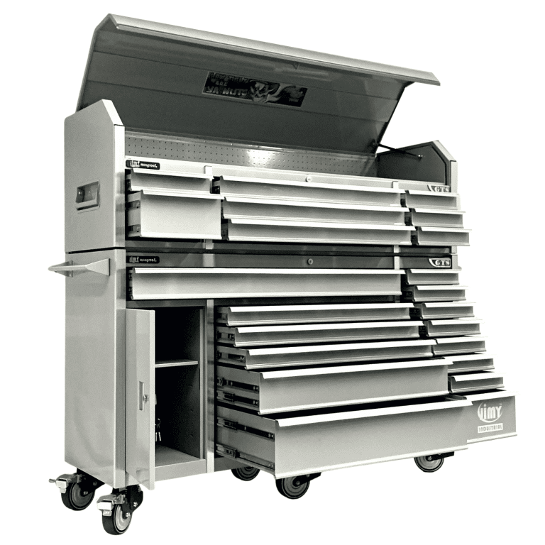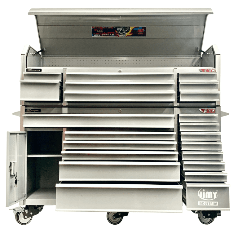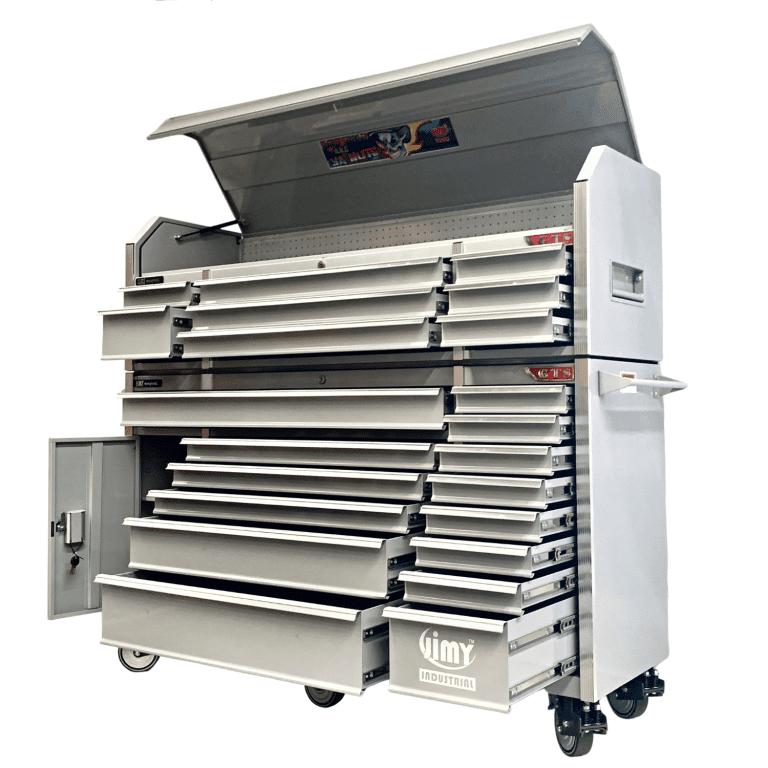 Jimy tool boxes are built to last! Tough industrial powder coating, 1.2mm gauge steel thickness, fully lockable & ball bearing slide rails on the drawers with twin slide rails on the deeper drawers.