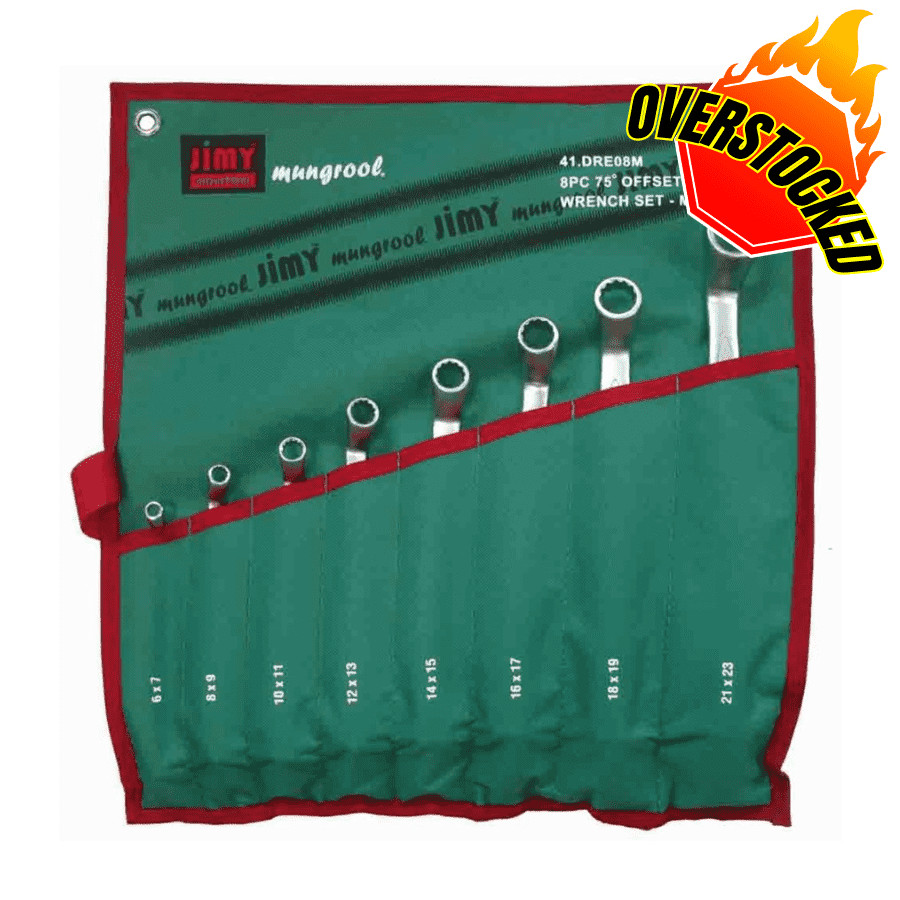The Jimy Tools 8 piece metric 75 degree off-set ring spanner set contains 16 of the most common metric sizes. Manufactured from quality chrome Vanadium steel (Cr-V) with a matt finish these standard length spanners are wrapped up in Jimy’s own “Rip Stop” canvas spanner roll and covered by Jimy’s lifetime warranty making this an excellent quality set and great value for money.