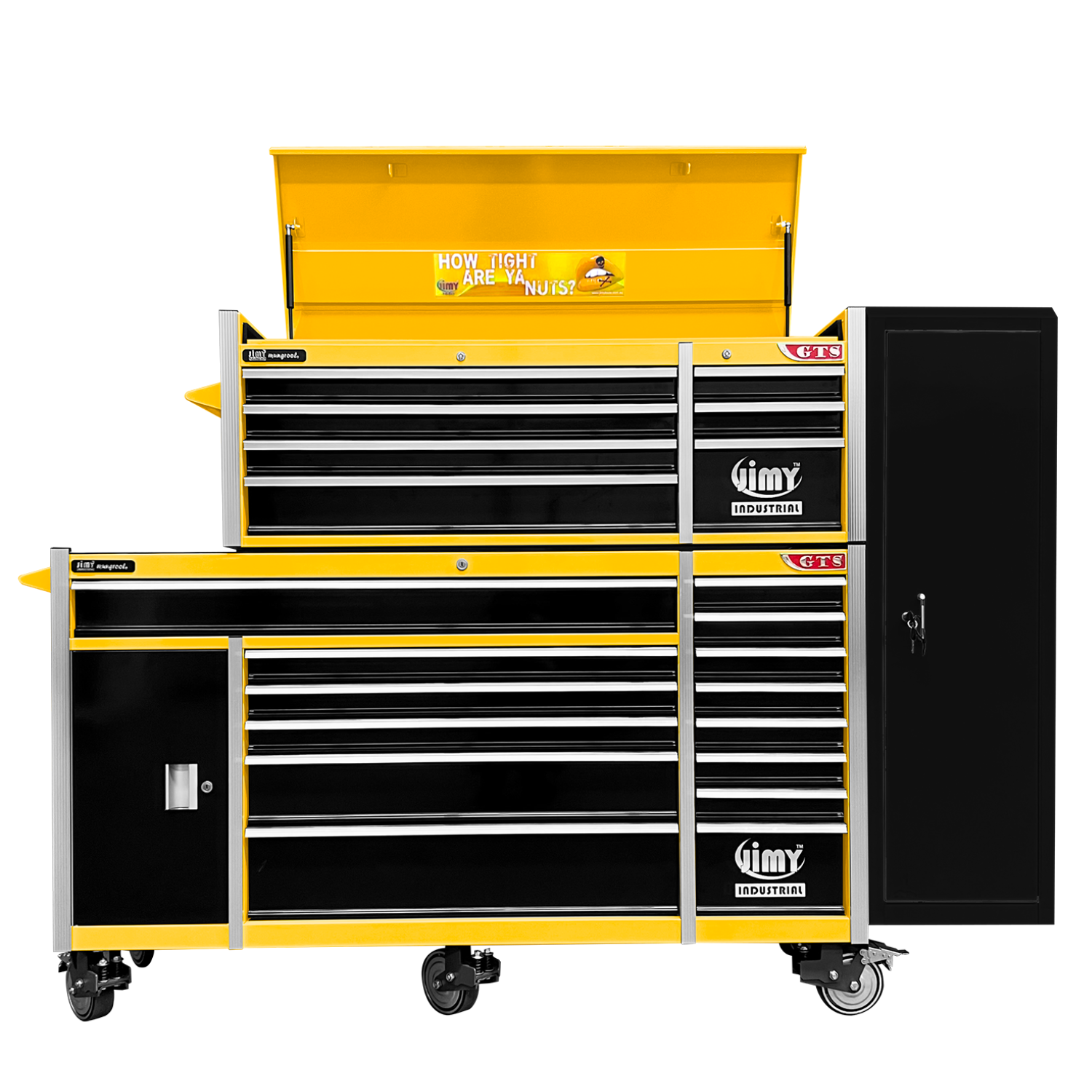 Jimy toolboxes are built to last! Tough industrial powder coating, 1.2mm gauge steel thickness, fully lockable & ball bearing slide rails on the drawers with twin slide rails on the deeper drawers.