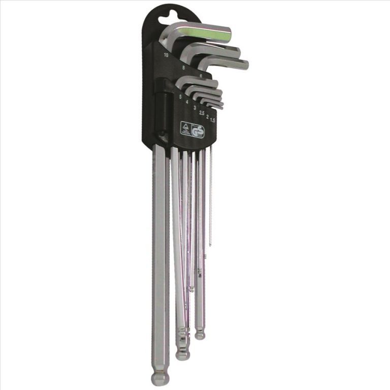 The Jimy Tools 9 piece SAE L-handle hex key (Allen key) set includes sizes 1/16” up to 3/8” featuring ball heads on the longer ends to allow access to socket head cap screws or set screws from angles up to 25 degrees. The L-handle set is made from chrome Vanadium steel (Cr-V) and polished to a mirror finish.