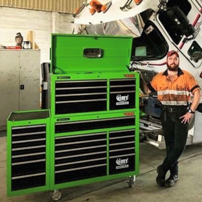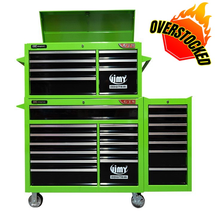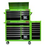 The 26 drawer “Monster Mechanic” tool kit from Jimy Tools offers a wide range of tools for the tradesperson. The kit consists of a 7 drawer top box and a 12 drawer roller cabinet with a 7 drawer side box attached all have been powder coated with a tough industrial finish, 1.0mm thick steel, fully lockable with rear internal locking system, dual gas strut system for lid and ball bearing slide drawers with twin slides on the deeper drawers.