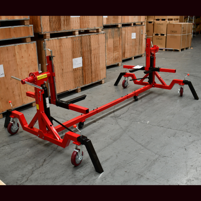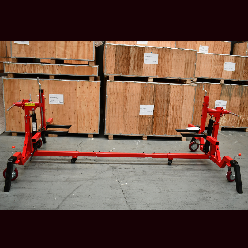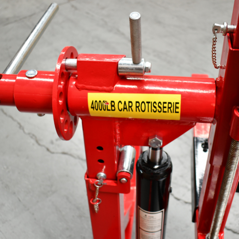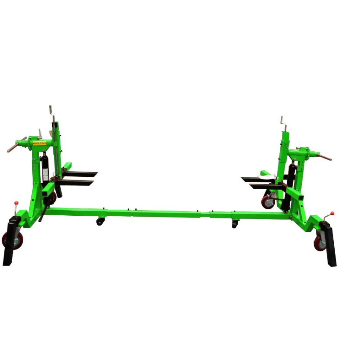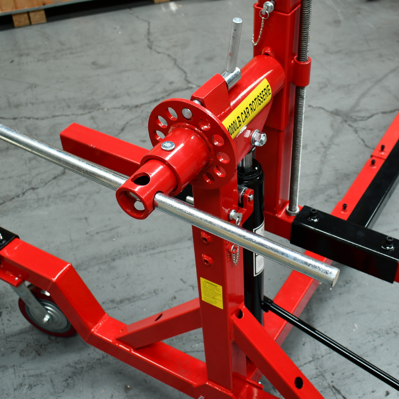 The car rotisserie is a universal restoration tool that lets the user turn the vehicle upside down with the assistance of a gearbox drive.