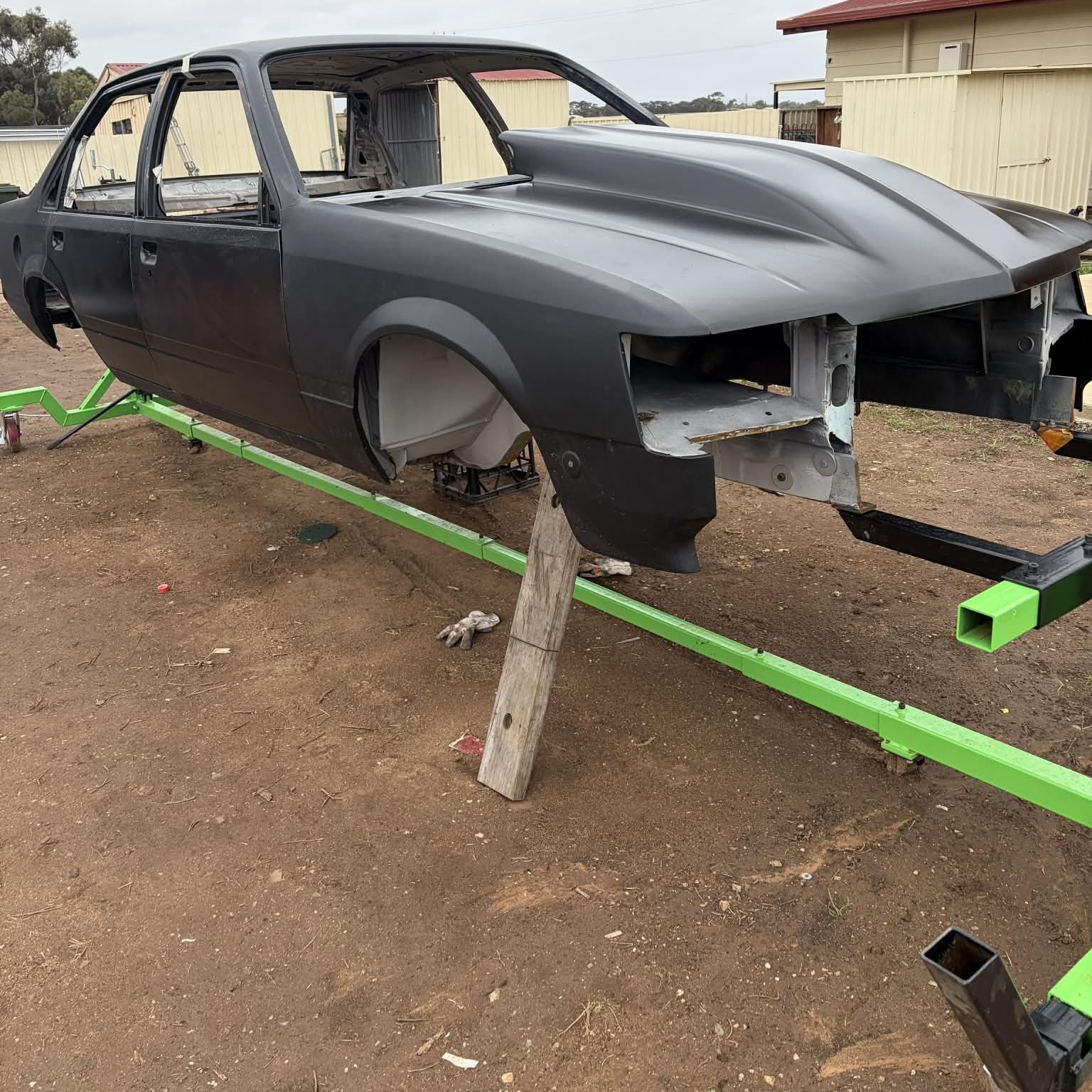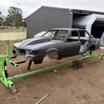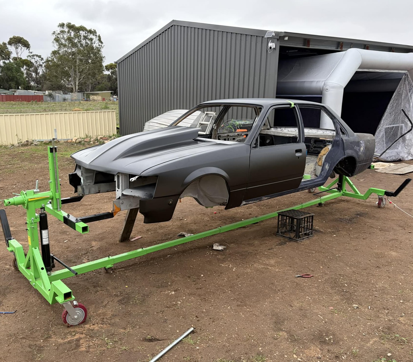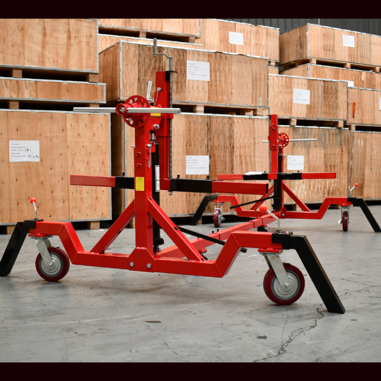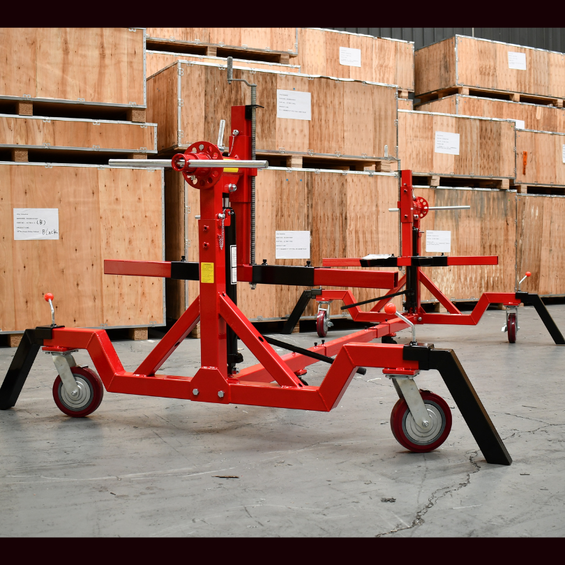 The car rotisserie is a universal restoration tool that lets the user turn the vehicle upside down with the assistance of a gearbox drive.