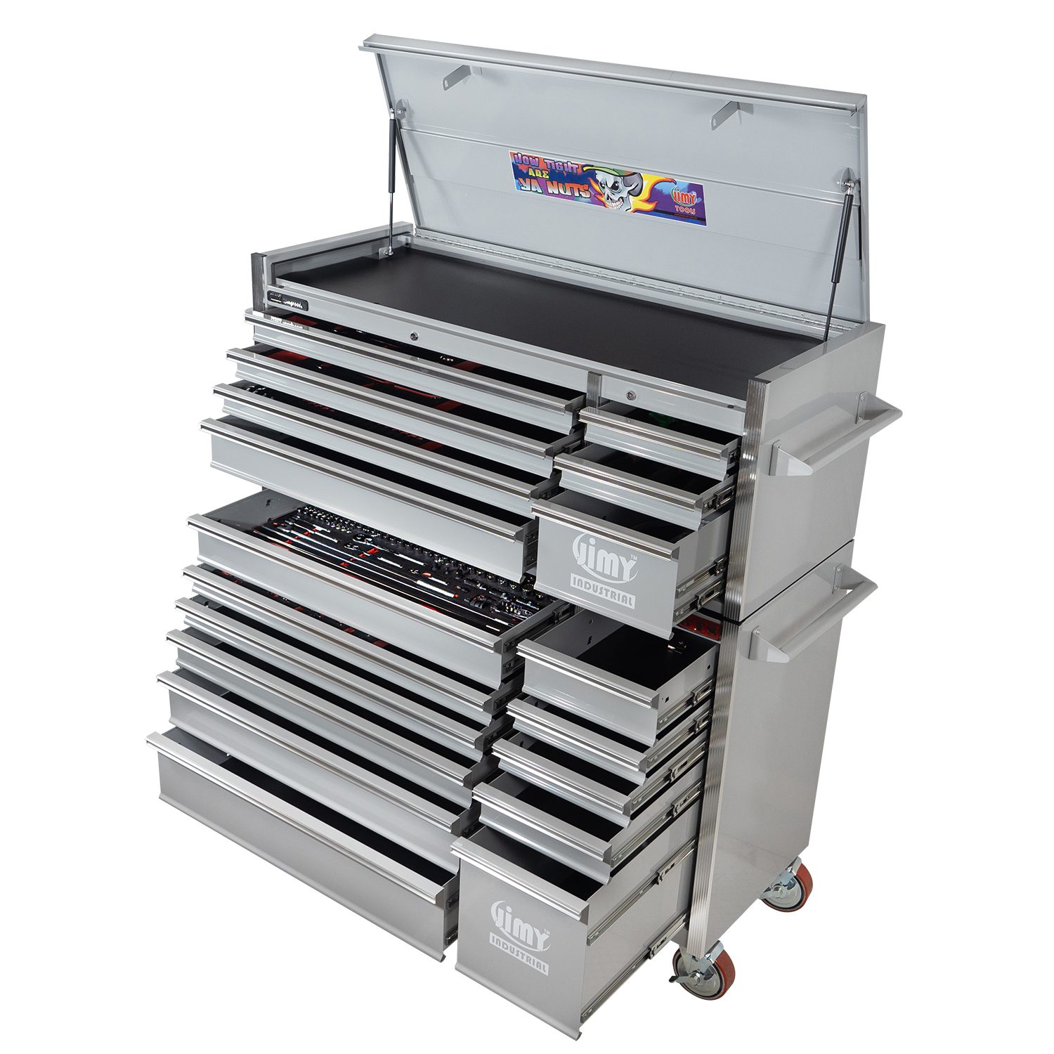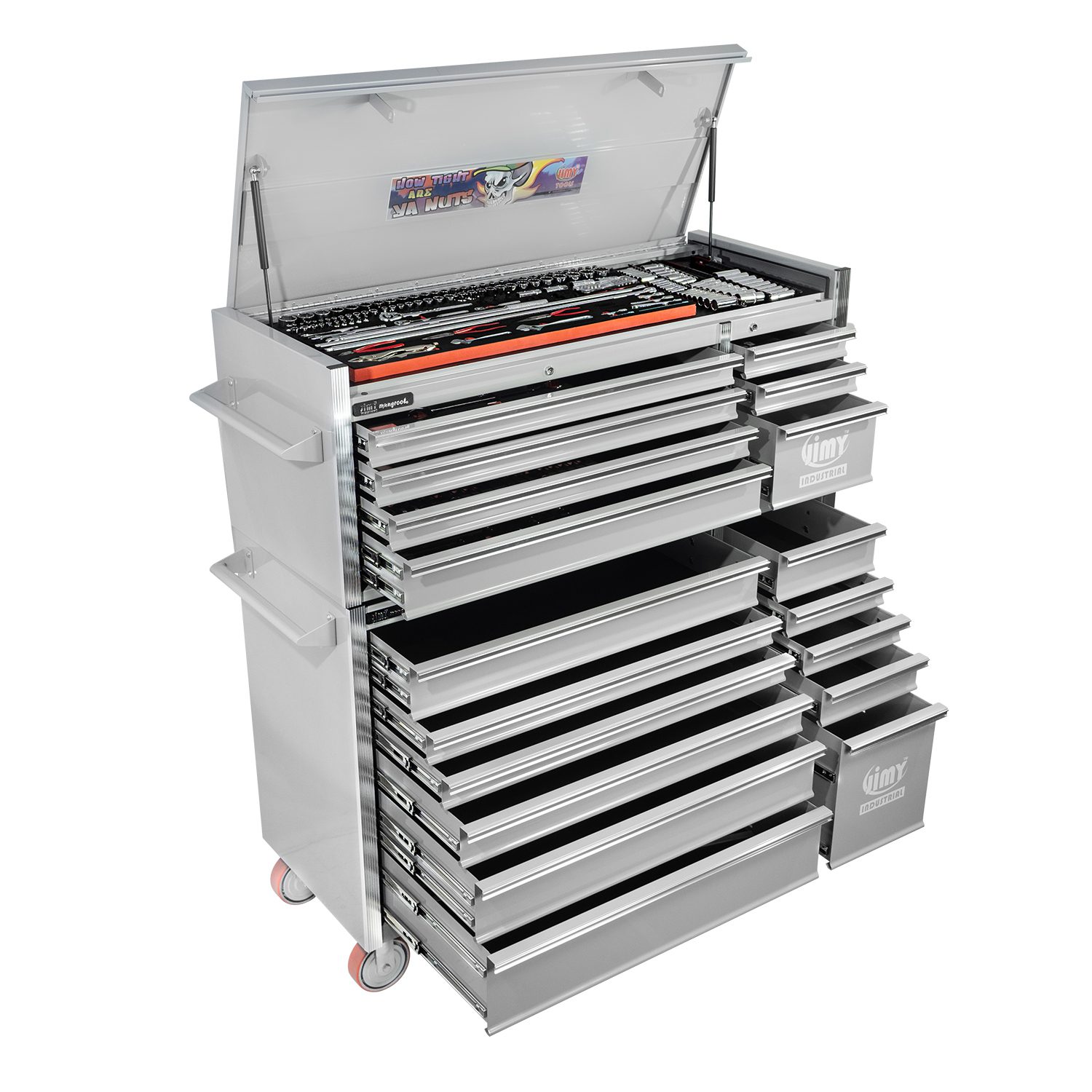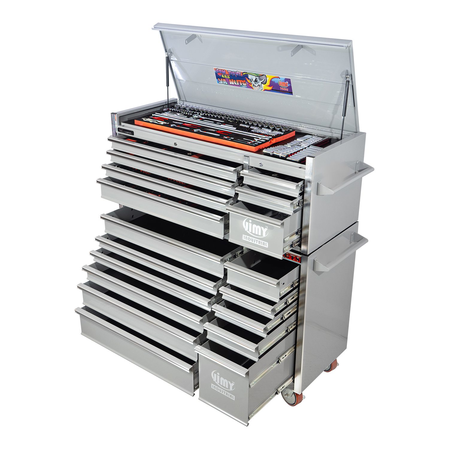 Jimy tool boxes are built to last! Tough industrial powder coating, 1.2mm gauge steel thickness, fully lockable & ball bearing slide rails on the drawers with twin slide rails on the deeper drawers.