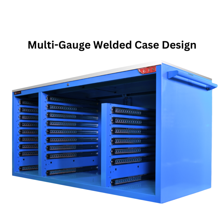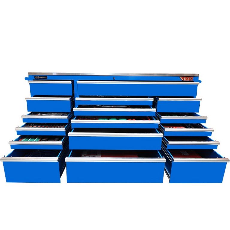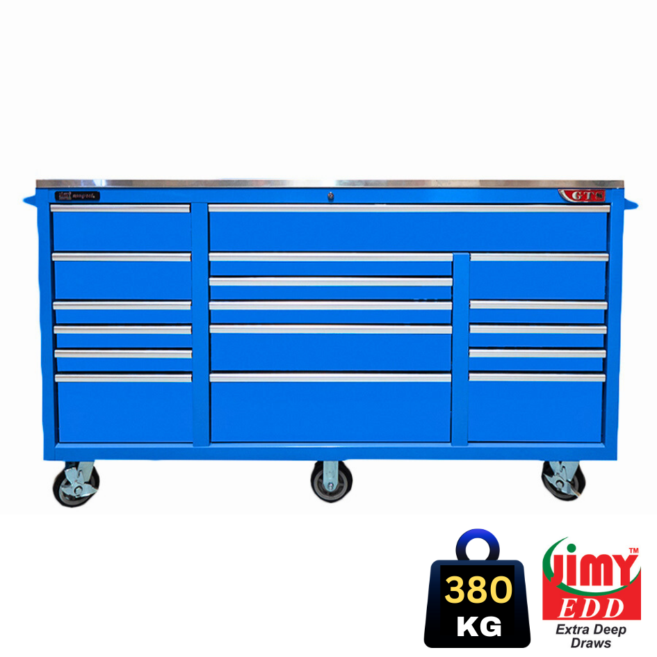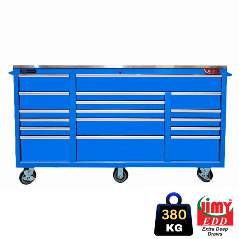 Jimy tool boxes are built to last! Tough industrial powder coating, 1.2mm gauge steel thickness, fully lockable & ball bearing slide rails on the drawers with twin slide rails on the deeper drawers. Drawers fitted with Click-lock mechanism.
