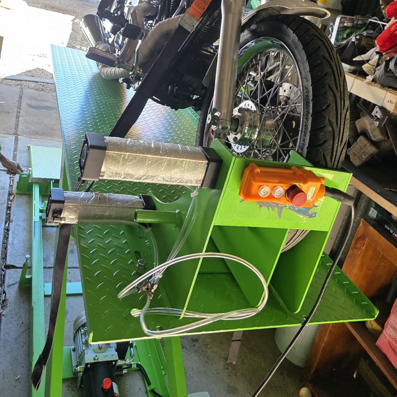 - Two pedal switches to control the pneumatic front tyre clamp.