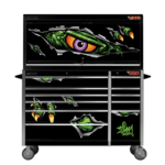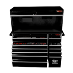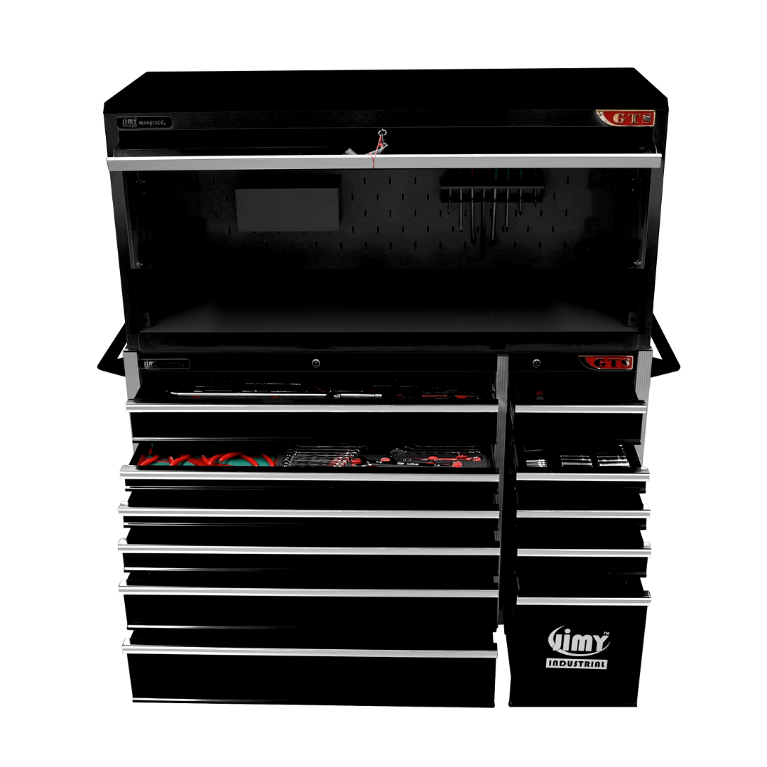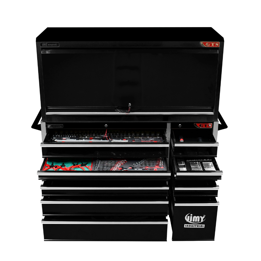 The 11 drawer “Intermediate” hutch tool workshop from Jimy Tools offers a great range of tools for the professional mechanic. The kit consists of a hutch top box and an 11-drawer roller cabinet, all have been powder coated with a tough industrial finish, 1.2mm thick steel, fully lockable with rear internal locking system, dual gas strut system for the hutch and ball bearing slide drawers with twin slides on the deeper drawers.