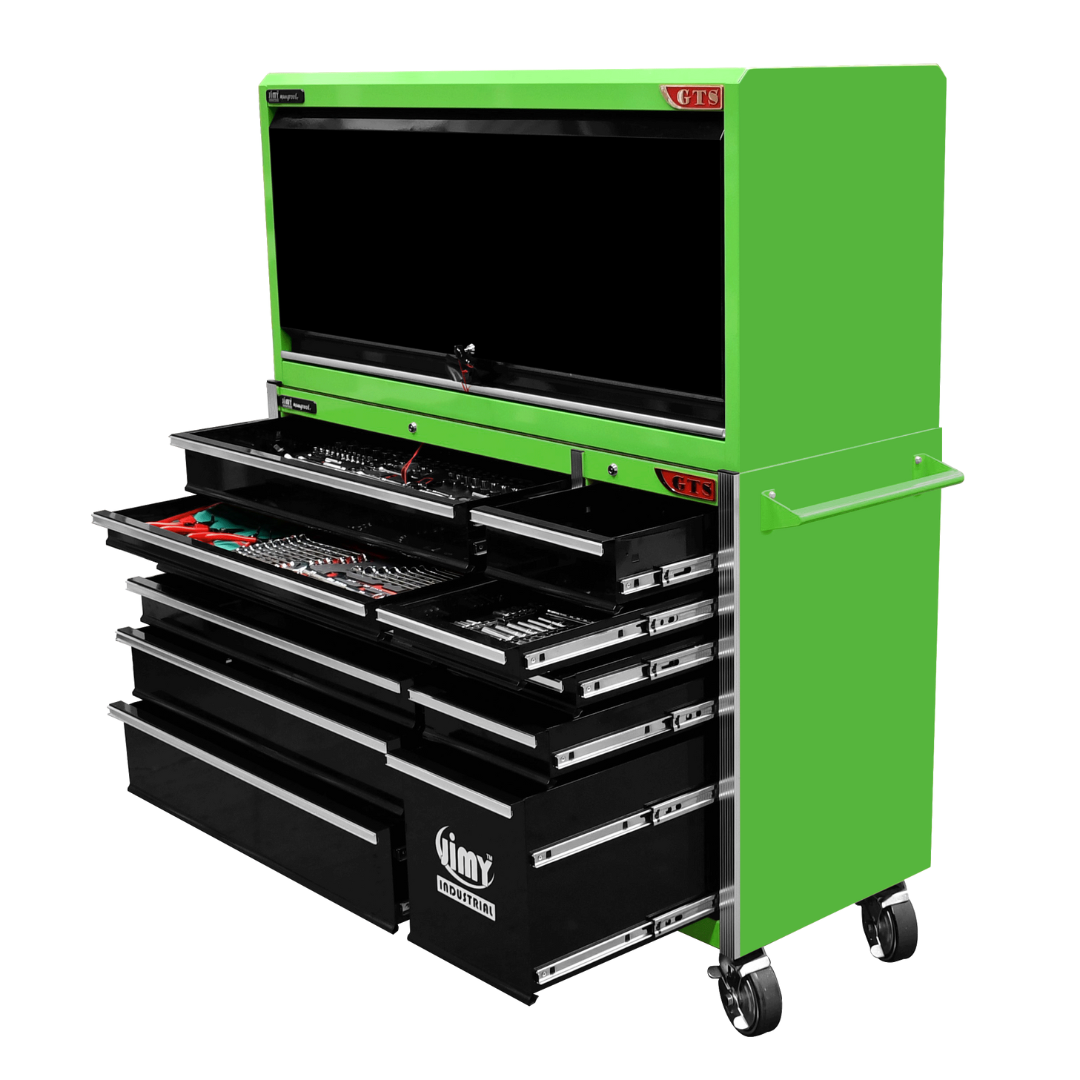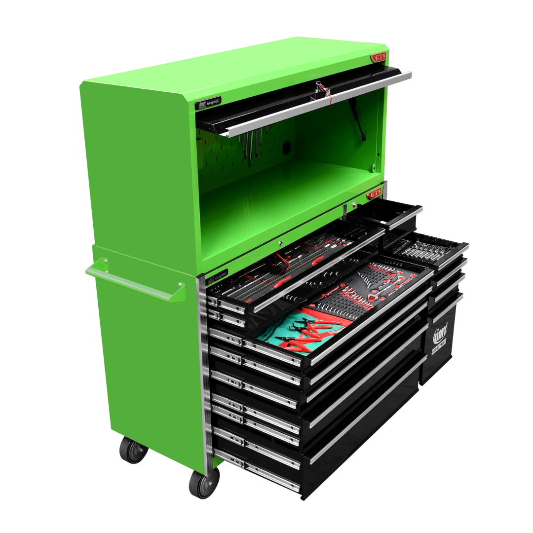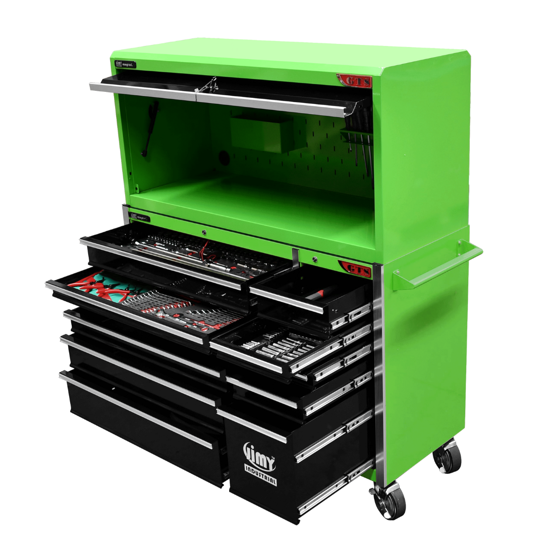 The 11 drawer “Intermediate” hutch tool workshop from Jimy Tools offers a great range of tools for the professional mechanic. The kit consists of a hutch top box and an 11-drawer roller cabinet, all have been powder coated with a tough industrial finish, 1.2mm thick steel, fully lockable with rear internal locking system, dual gas strut system for the hutch and ball bearing slide drawers with twin slides on the deeper drawers.
