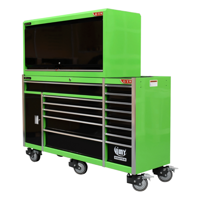 The 14 drawer “Intermediate” hutch tool workshop from Jimy Tools offers a great range of tools for the professional mechanic. The kit consists of a hutch top box and an 11-drawer roller cabinet, all have been powder coated with a tough industrial finish, 1.2mm thick steel, fully lockable with rear internal locking system, dual gas strut system for the hutch and ball bearing slide drawers with twin slides on the deeper drawers.