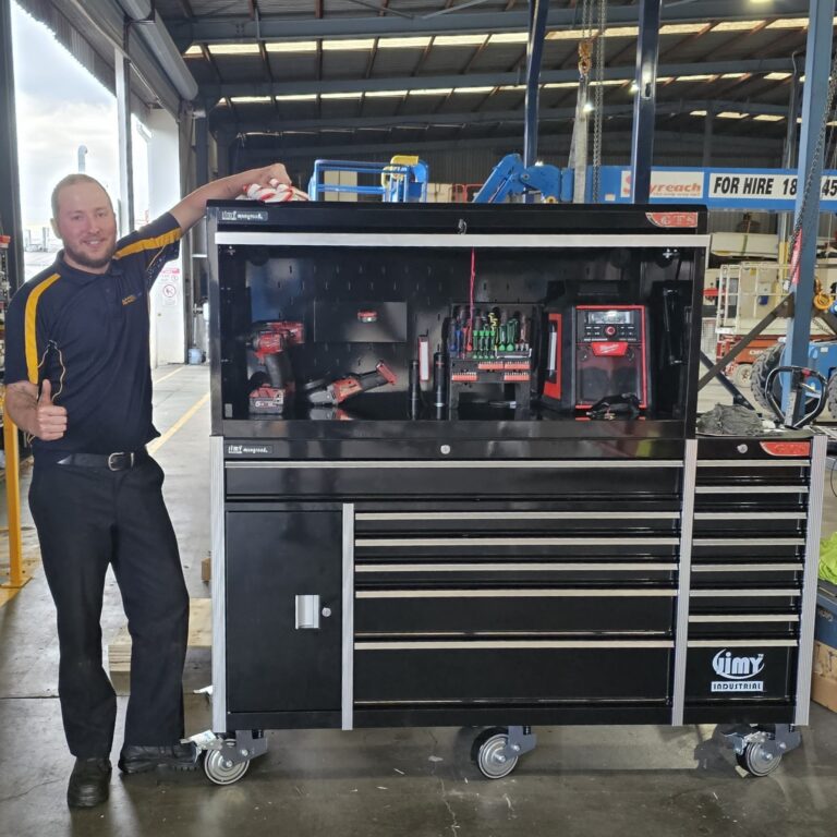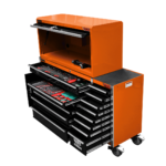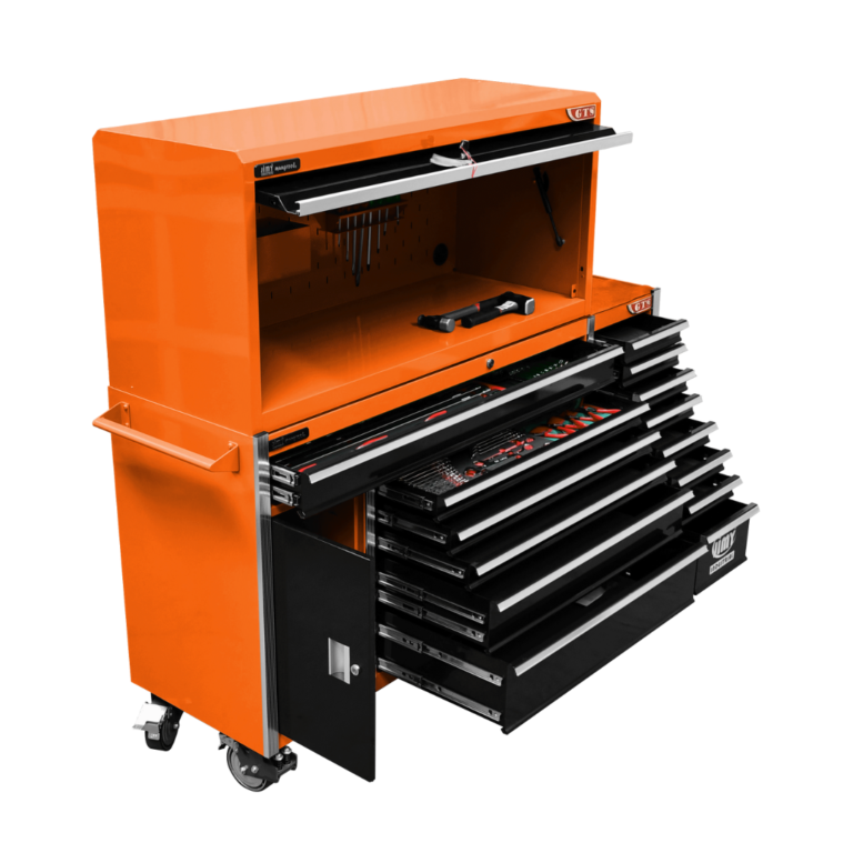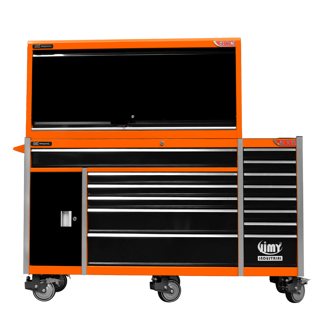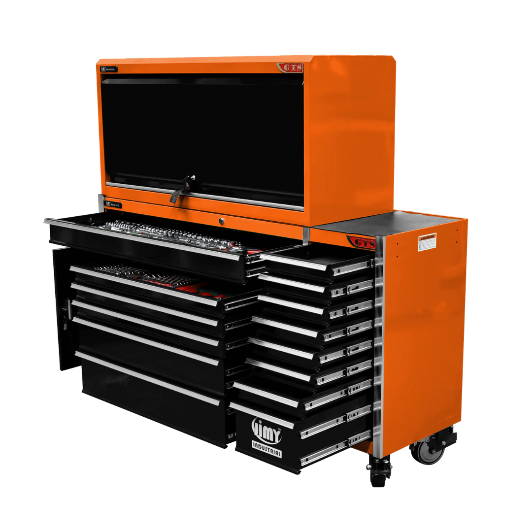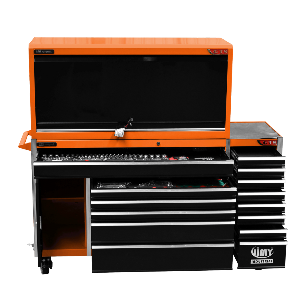 The 14 drawer “Intermediate” hutch tool workshop from Jimy Tools offers a great range of tools for the professional mechanic. The kit consists of a hutch top box and an 11-drawer roller cabinet, all have been powder coated with a tough industrial finish, 1.2mm thick steel, fully lockable with rear internal locking system, dual gas strut system for the hutch and ball bearing slide drawers with twin slides on the deeper drawers.