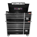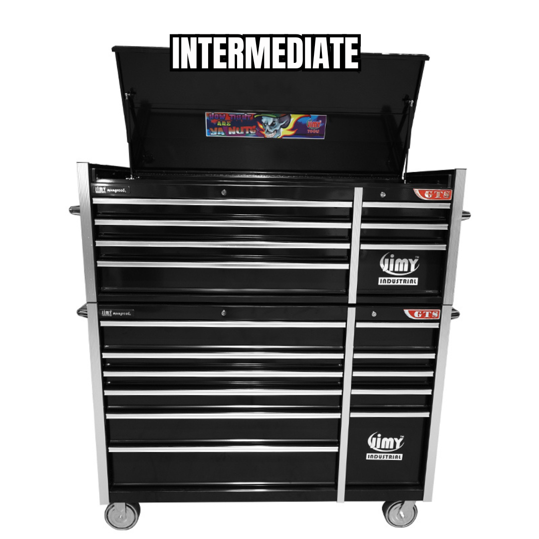 The 18 drawer roller cabinet ‘GTS’ Mechanic’s Tool Kit from Jimy Tools offers a wide range of tools for the trade’s person. The kit consists of a 7 drawer 56” ‘GTS’ tool chest and an 11 drawer 56” ‘GTS’ roller cabinet. Both the tool chest and the roller cabinet have been powder coated with a tough industrial finish and features include 1.2mm thick steel, fully lockable with rear internal locking system and ball bearing slide drawers with twin slides on the deeper drawers. The tool chest also offers a dual gas strut system for the lid.