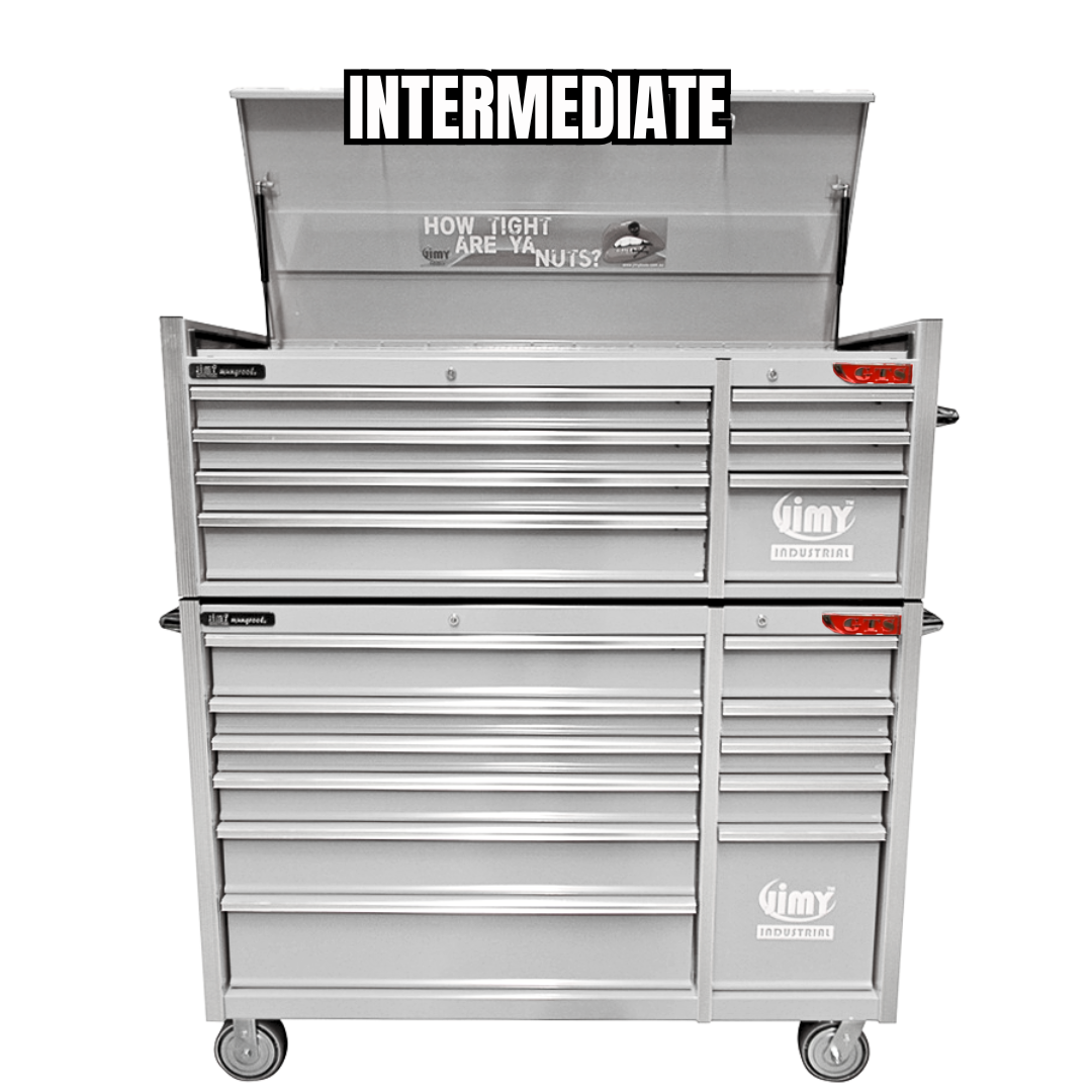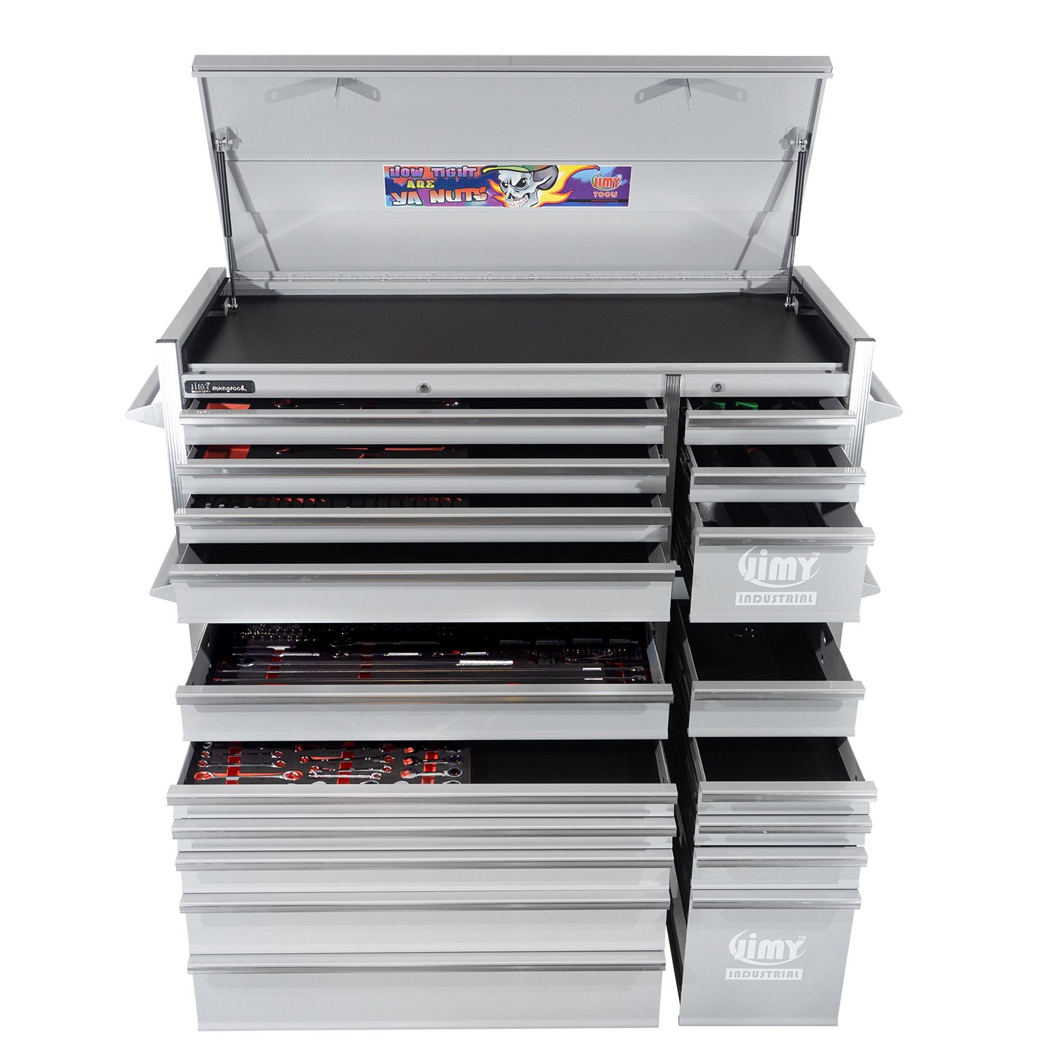 The 18 drawer roller cabinet ‘GTS’ Mechanic’s Tool Kit from Jimy Tools offers a wide range of tools for the trade’s person. The kit consists of a 7 drawer 56” ‘GTS’ tool chest and an 11 drawer 56” ‘GTS’ roller cabinet. Both the tool chest and the roller cabinet have been powder coated with a tough industrial finish and features include 1.2mm thick steel, fully lockable with rear internal locking system and ball bearing slide drawers with twin slides on the deeper drawers. The tool chest also offers a dual gas strut system for the lid.