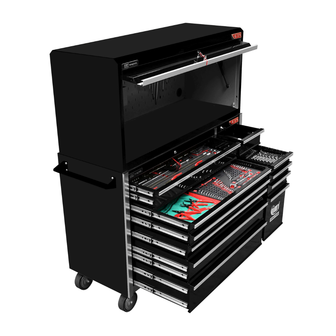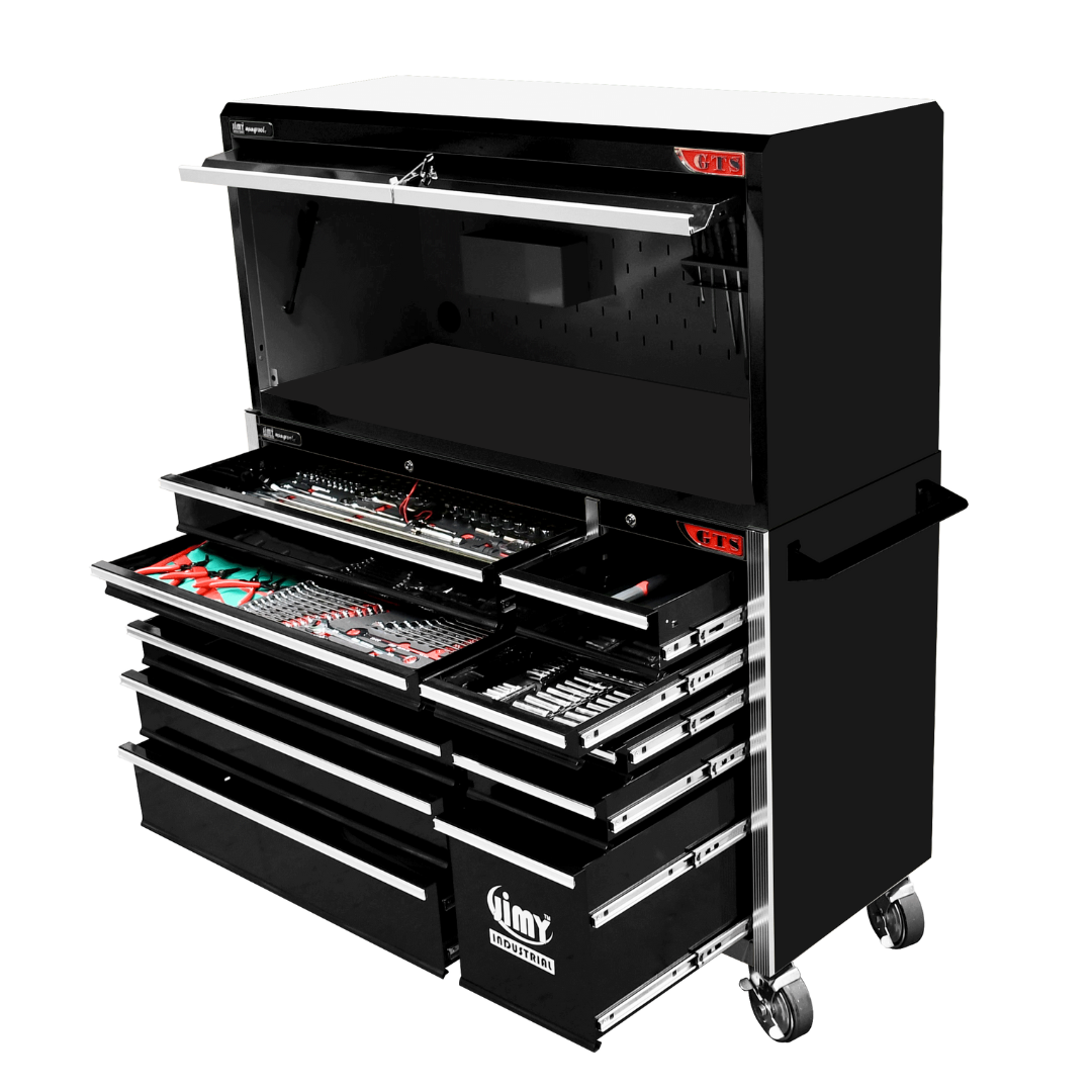 The 11 drawer “Introductory” hutch tool workshop from Jimy Tools offers a great range of tools for the professional mechanic. The kit consists of a hutch top box and an 11-drawer roller cabinet, all have been powder coated with a tough industrial finish, 1.2mm thick steel, fully lockable with rear internal locking system, dual gas strut system for the hutch and ball bearing slide drawers with twin slides on the deeper drawers. Included are metric 4mm – 32mm and SAE 5/32” – 1-1/4” sockets and a full complement of 1/4”, 3/8” and 1/2” drive socket accessories including ratchets, breaker bars, extensions bars from 50mm up to 900mm long.