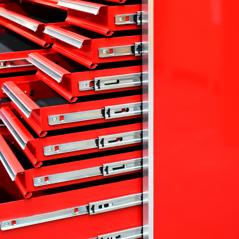 Jimy tool boxes are built to last with a tough industrial powder coating, 1.0mm thick steel, fully lockable with a rear internal locking system, dual gas strut system for lid & ball bearing slide drawers with twin slides on the deeper drawers.