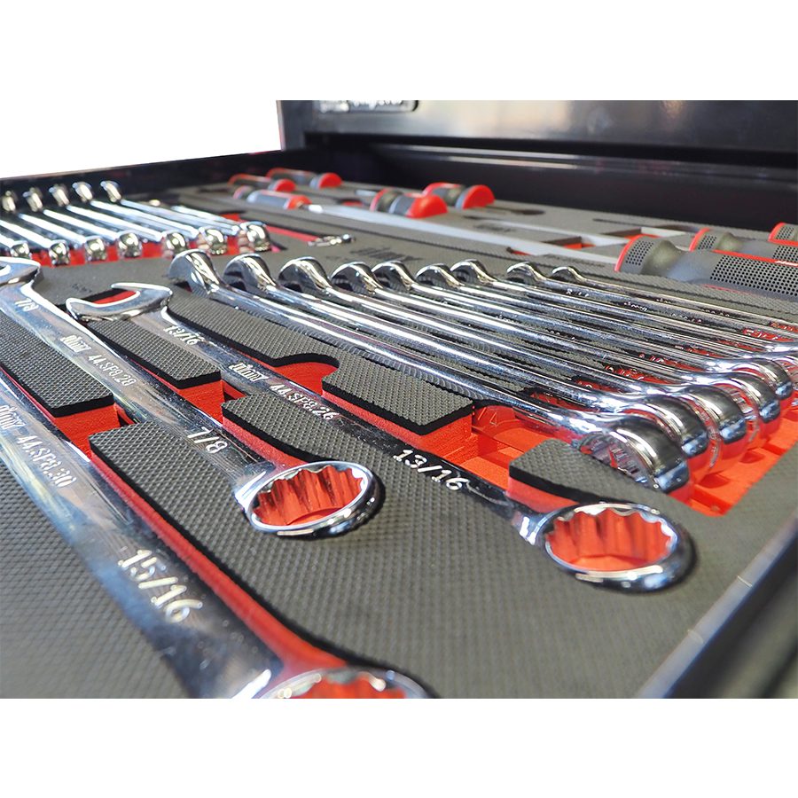 This 19 drawer tool kit from Jimy Tools is the perfect place to start if your new to the mechanical trades or an old hand this tool kit consists of a 7 drawer top box and 12 drawer roller cabinet with a full complement of sockets in 1/4” 3/8” & 1/2” square drives Short and Deep with all the extension bars, ratchets and breaker bars to suit. Also included are ROE spanners in metric and SAE, pliers, screwdrivers, Allen keys etc. check out the full list of contents below. With the high density foam drawer inserts you can easily see if you have left a tool on the job.
