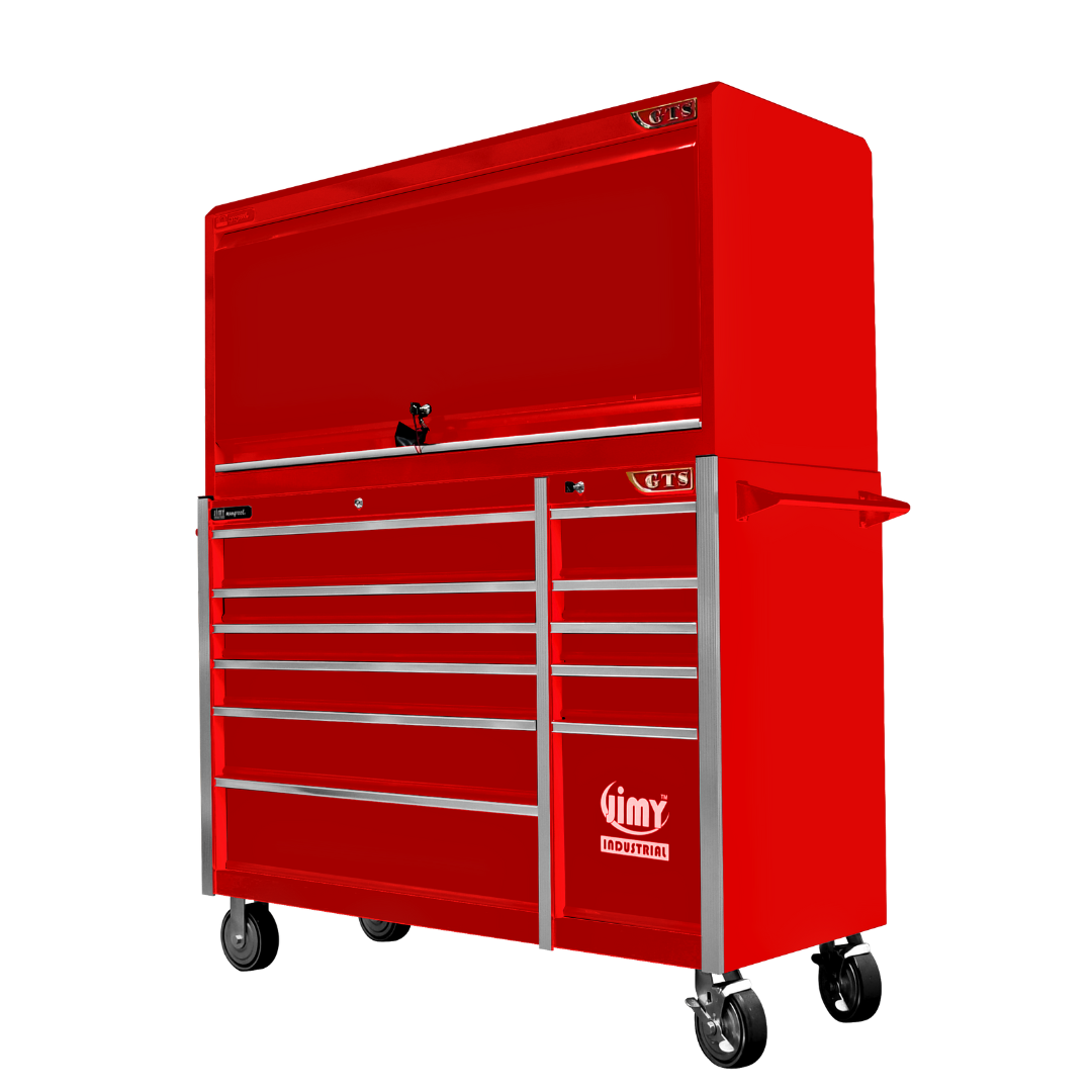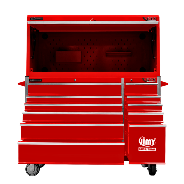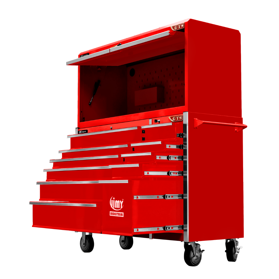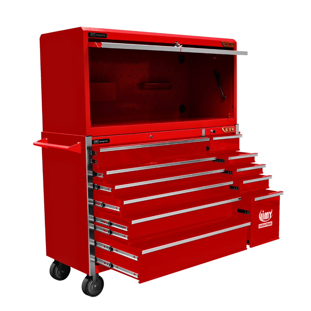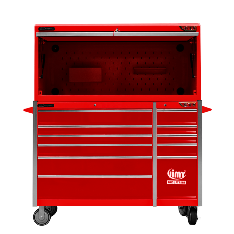 Jimy tool boxes are career spanning and built to last! Jimy tool boxes are fully modular to offer a number of storage combinations to fit your needs. With the extra deep 500mm drawers our 56” roller cabinet and bulky bench space, screwdriver holder, can organizer and a back panel pegboard featured in the hutch expands your storage capabilities. It features 11 drawers with full-width drawer handles, pre-cut drawer liners and a single integrated barrel lock. Durable full extension ball bearings and a tough power coated finish make this storage a perfect fit for your home garage or commercial workshop.