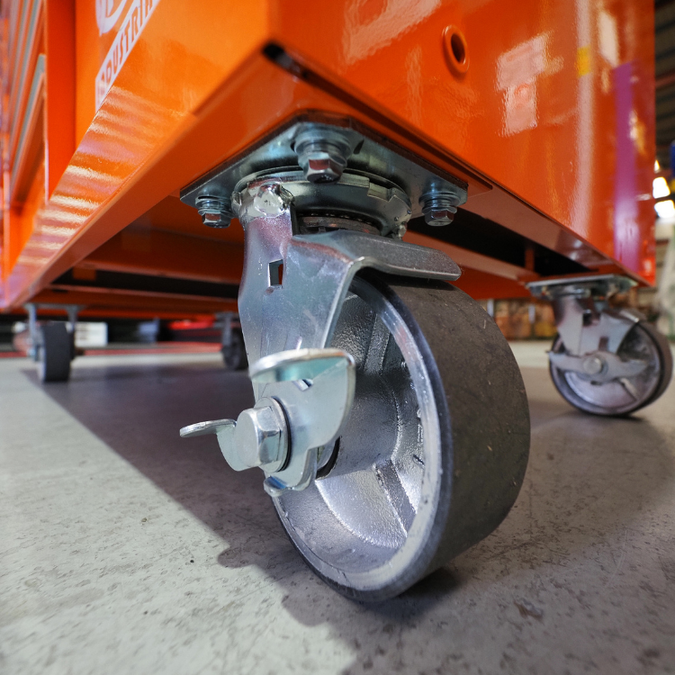 - 5” high casters wheels and 2” wide (2 fixed, 2 locking swivel) provide easy mobility when fully loaded