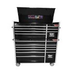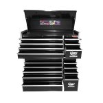 - 18 drawers for easy organisation of hand tools and everything else you need. The bottom right hand drawer is an extra large compartment for storage on bulky and heavy items such as larger power tools etc. Drawers are easily removable.