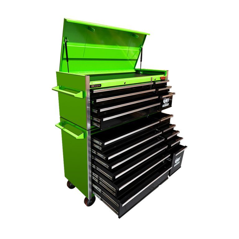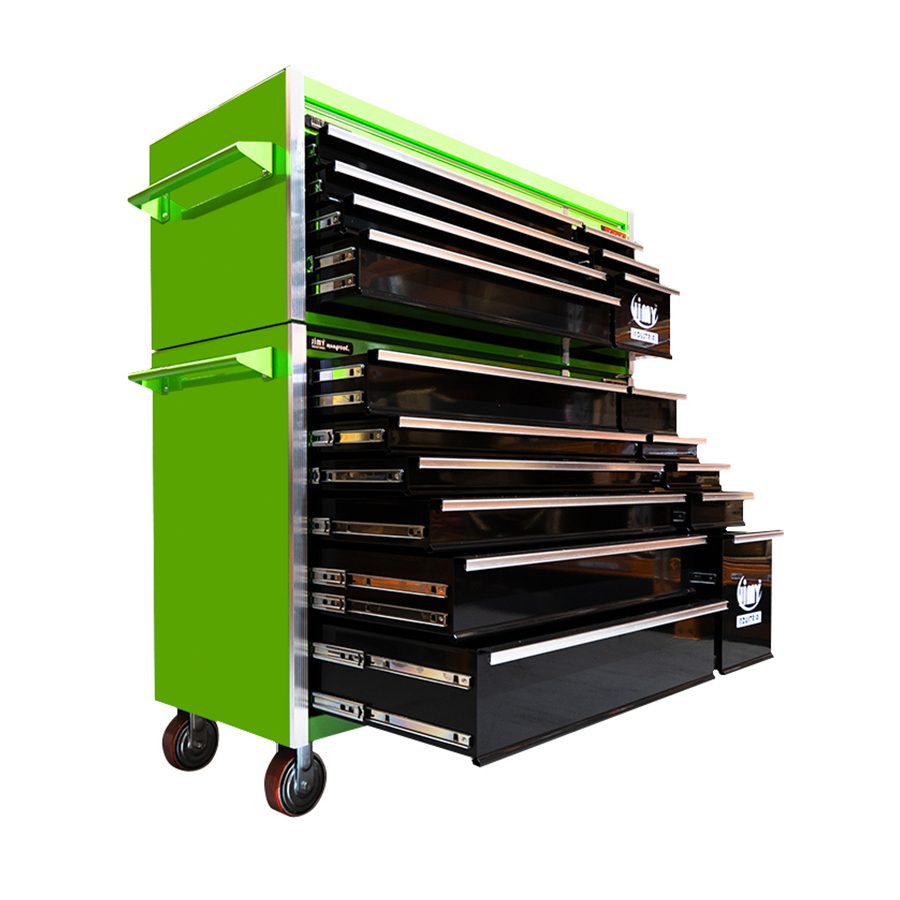 Jimy tool boxes are career spanning and built to last! Jimy tool boxes are fully modular to offer a number of storage combinations to fit your needs. With the extra deep 500mm drawers our 56” workshop expands your storage capabilities and a massive 1930kgs in weight load capacity. It features 18 drawers with full-width drawer handles, pre-cut drawer liners and a single integrated barrel lock. Durable full extension ball bearings and a tough power coated finish make this storage a perfect fit for your home garage or commercial workshop.
