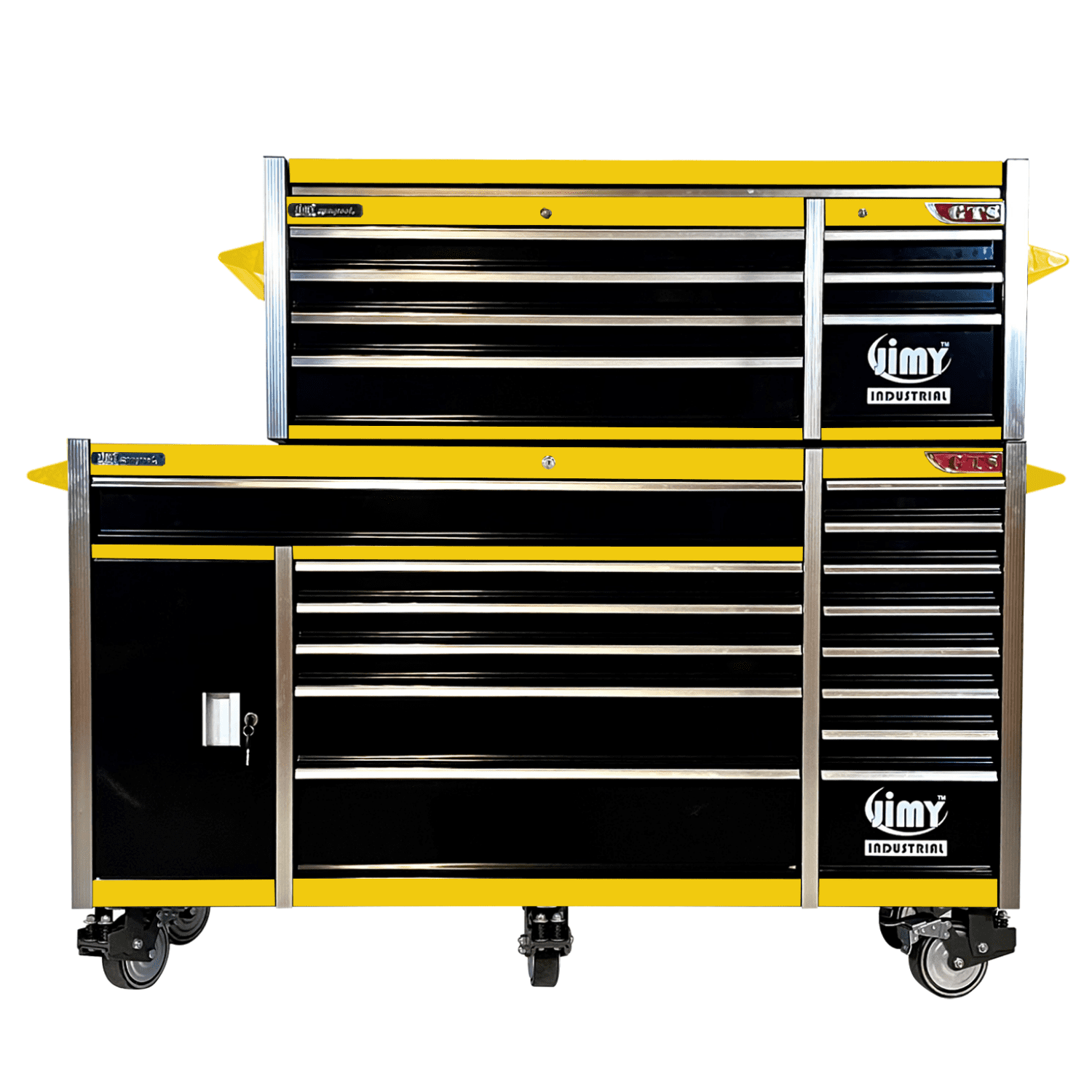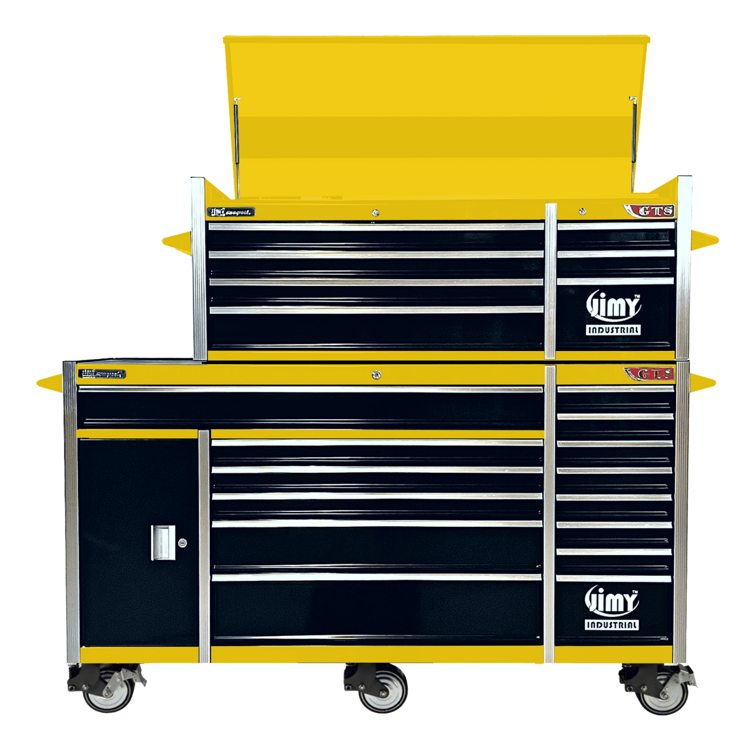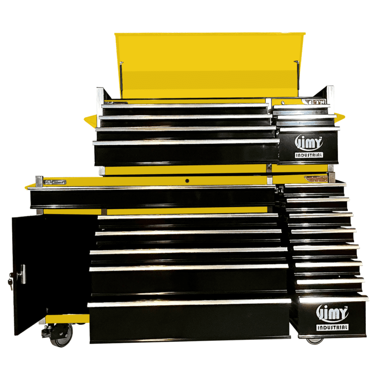 Jimy tool boxes are built to last with a tough industrial powder coating, 1.2mm thick steel, fully lockable with a rear internal locking system, ball bearing slide drawers with twin slides on the deeper drawers and 6” x 2” heavy duty castors. There is also a lockable side cupboard with shelving for added convenience.