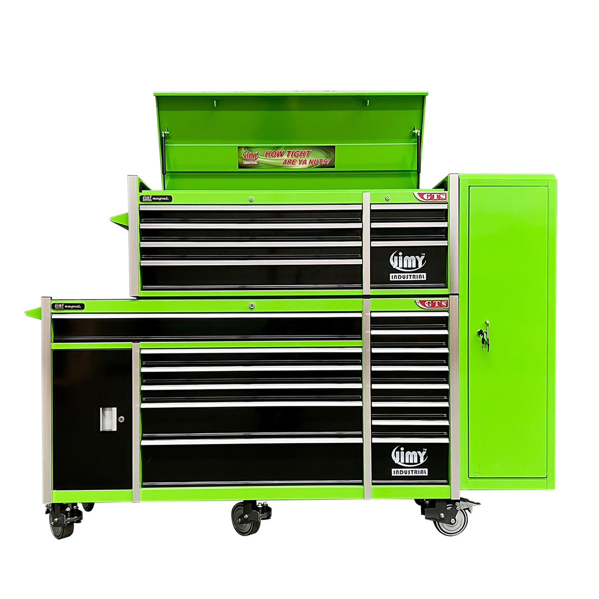 Jimy tool boxes are career spanning and built to last! Jimy tool boxes are fully modular to offer a number of storage combinations to fit your needs. With the extra deep 500mm drawers our 72” roller cabinet, 56” top chest & 16” side locker expands your storage capabilities and has a massive 2780kgs in weight load capacity. It features 23 drawers with full-width drawer handles, pre-cut drawer liners and a single integrated barrel lock. Durable full extension ball bearings and a tough power coated finish make this storage a perfect fit for your home garage or commercial workshop.