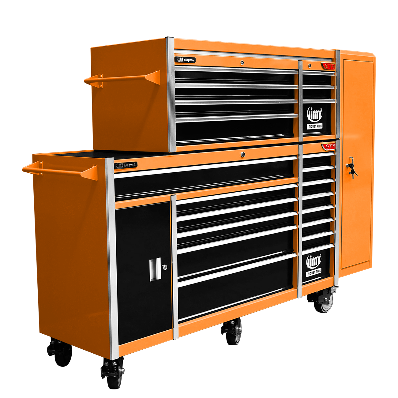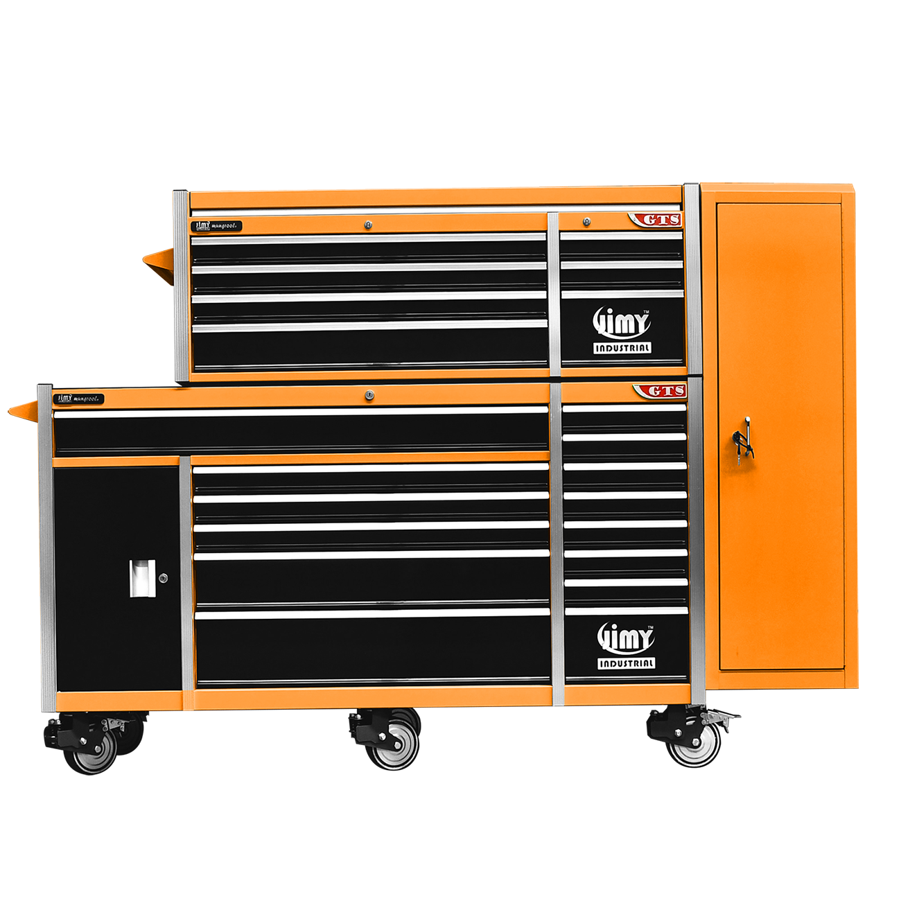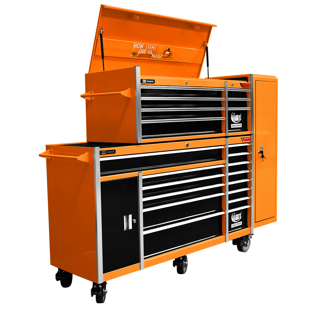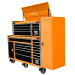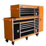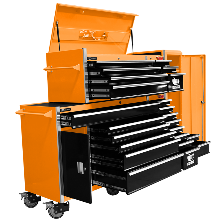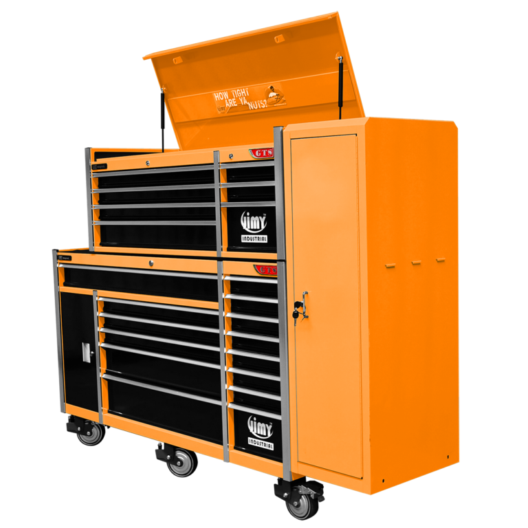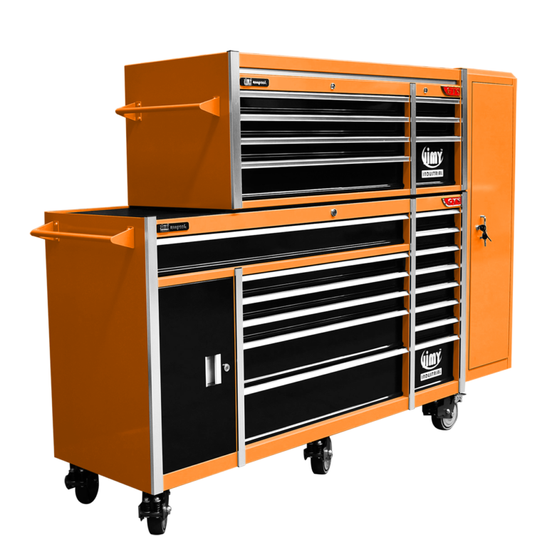 Jimy tool boxes are career spanning and built to last! Jimy tool boxes are fully modular to offer a number of storage combinations to fit your needs. With the extra deep 500mm drawers our 72” roller cabinet, 56” top chest & 16” side locker expands your storage capabilities and has a massive 2780kgs in weight load capacity. It features 23 drawers with full-width drawer handles, pre-cut drawer liners and a single integrated barrel lock. Durable full extension ball bearings and a tough power coated finish make this storage a perfect fit for your home garage or commercial workshop.