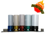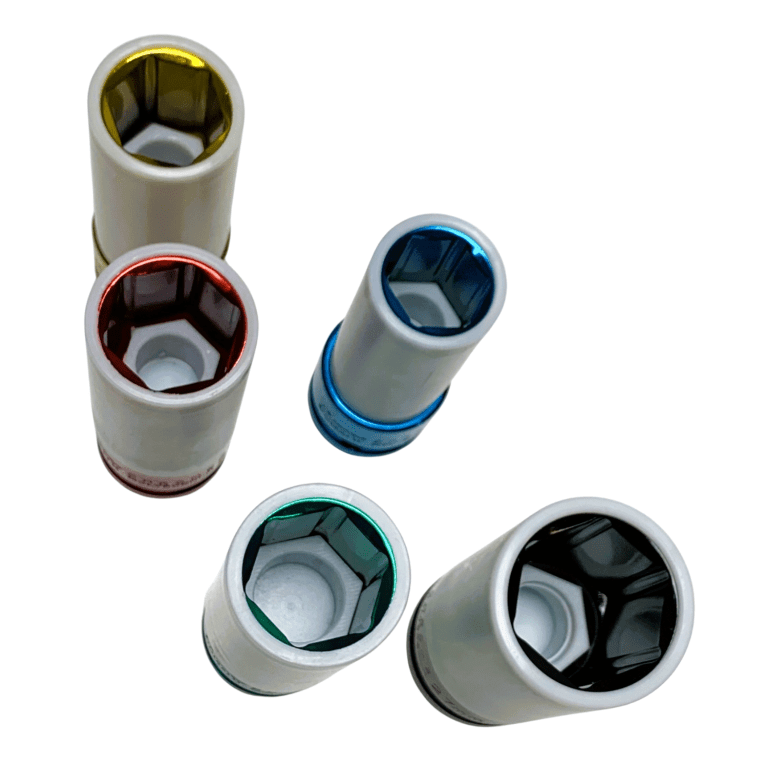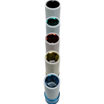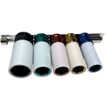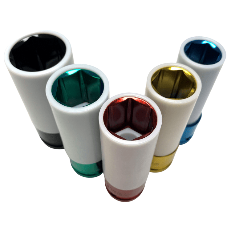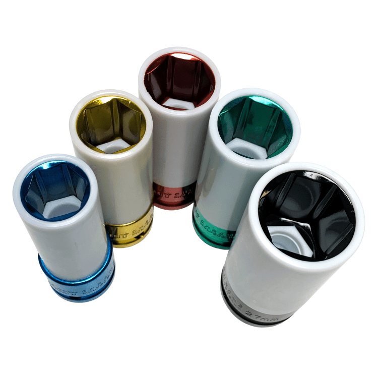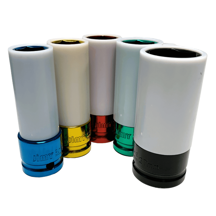 The Jimy Tools mag wheel nut impact set contains 5 of the most common metric wheel nut sizes. These thin walled impact sockets have a vinyl sleeve around them and a nylon insert inside them to protect your mag wheels or specialty rims and nuts from damage during removal and replacement. The sockets are designed for use with impact tools and are colour coded for ease of identification and supplied in a blow mould plastic case.