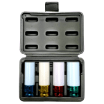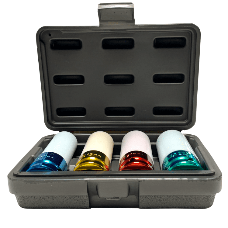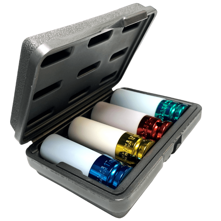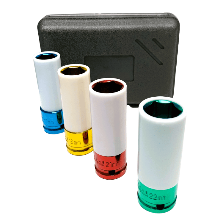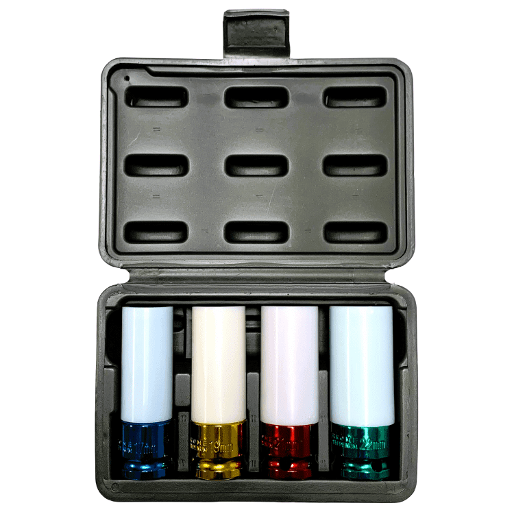 The Jimy Tools mag wheel nut impact set contains 4 of the most common metric wheel nut sizes. These thin walled impact sockets have a vinyl sleeve around them and a nylon insert inside them to protect your mag wheels or specialty rims and nuts from damage during removal and replacement. The sockets are designed for use with impact tools and are colour coded for ease of identification and supplied in a blow mould plastic case.