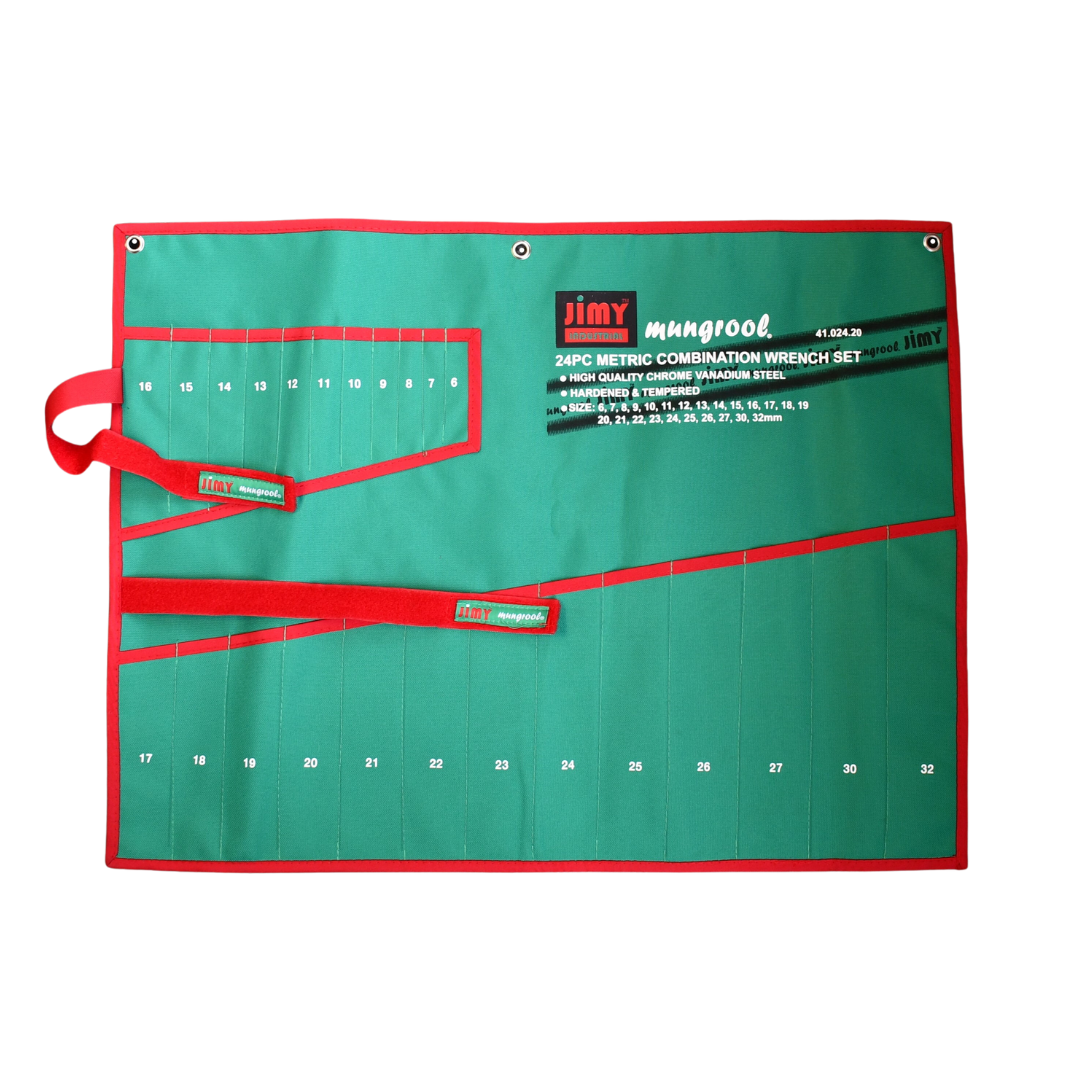 Jimy’s own “Rip Stop” canvas spanner roll with eyelets. 24-piece slotted pouch available for sizes 6mm-32mm.