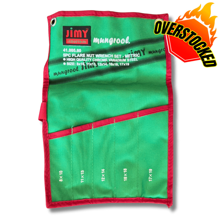 Jimy’s own “Rip Stop” canvas spanner roll with eyelets. 5-piece slotted pouch with sizes labelled.