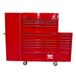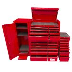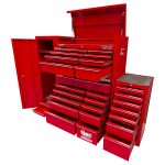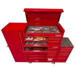 This 27 drawer tool kit from Jimy Tools offers a wide range of tools for the trade’s person. This tool kit consists of a 8 drawer top box, 11 drawer roller cabinet, 7 drawer side box and 1 full height side cabinet with 3 shelves and 2 drawers. It comes with a full complement of sockets in 1/4” 3/8” & 1/2” square drives Short and Deep with all the extension bars, ratchets and breaker bars to suit. Also included are ROE spanners in metric and SAE, pliers, screwdrivers, Allen keys etc. check out the full list of contents below. With the high density foam drawer inserts you can easily see if you have left a tool on the job.